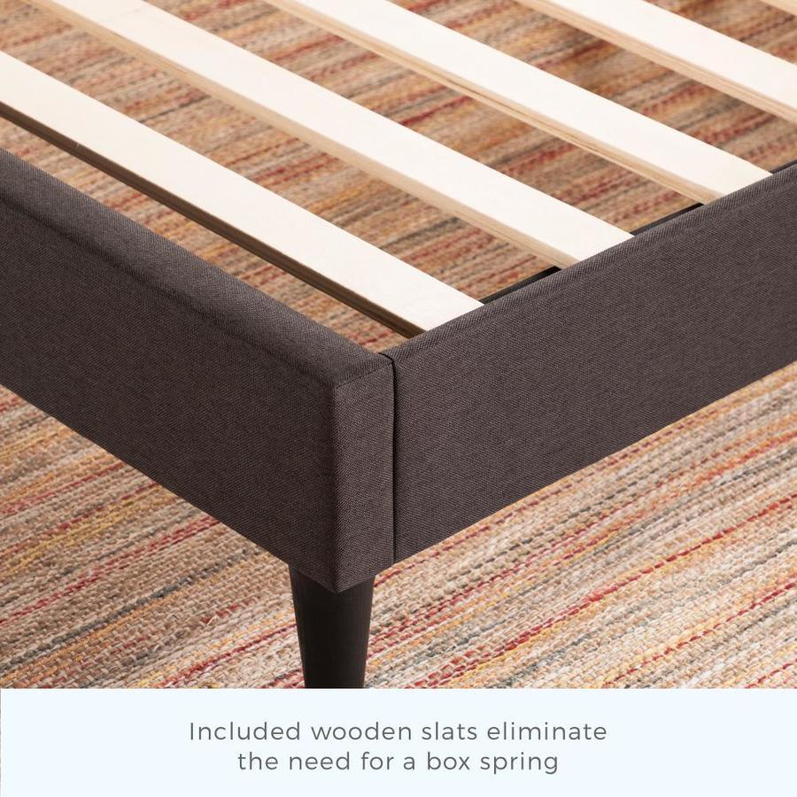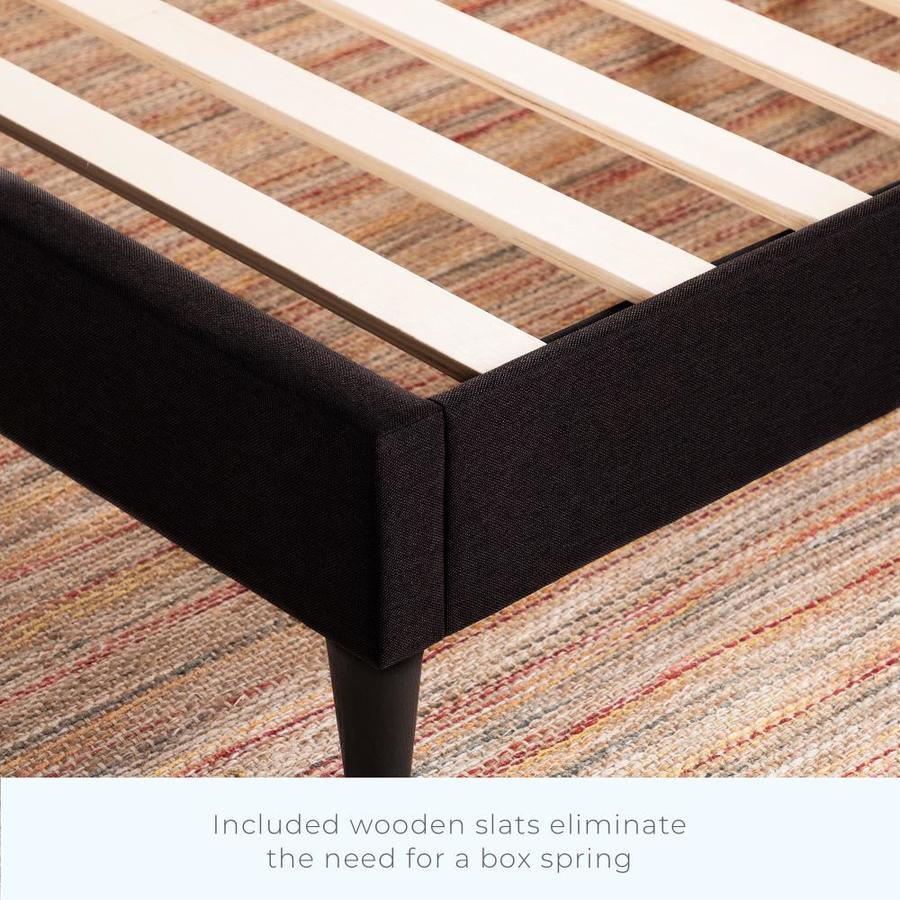 Bed frame has thick side rails and wooden slats that eliminate the need for a box spring