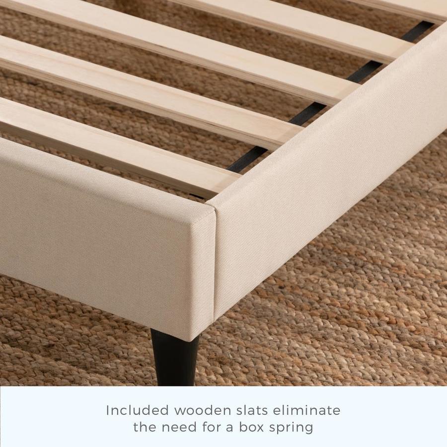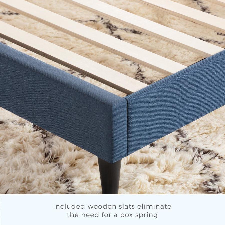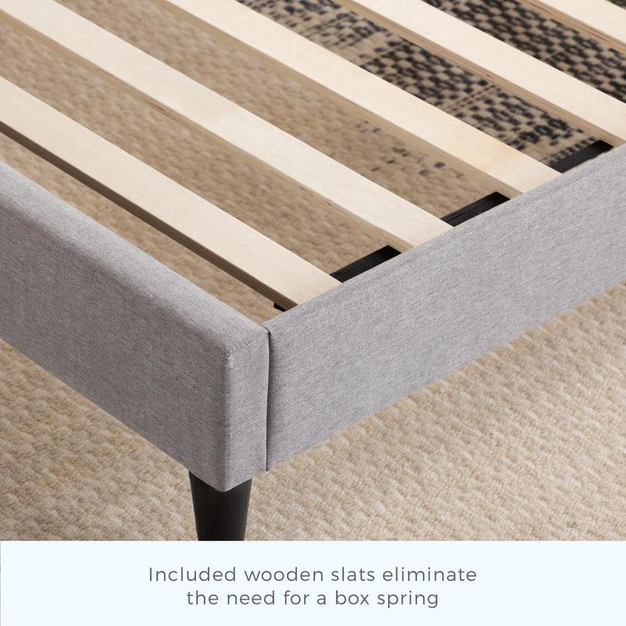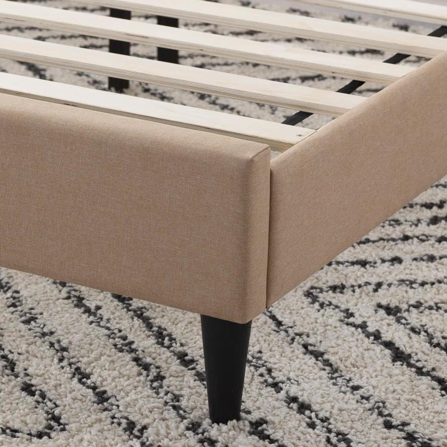 Elegantly modern upholstered platform bed frame with slats and a matching upholstered headboard