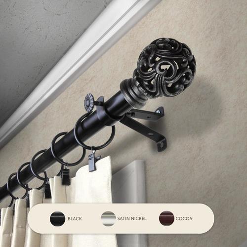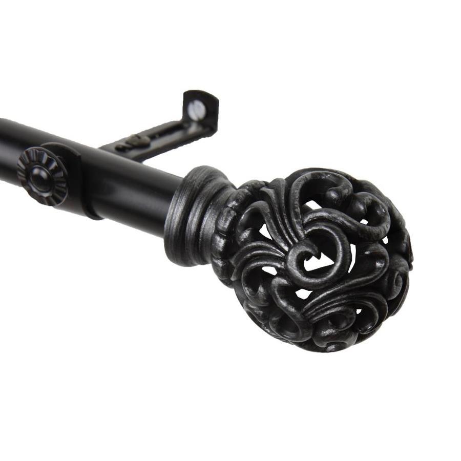 Includes one 13/16-in diameter adjustable pole, extends 120-170 inch, four brackets, one pair of decorative finials, and mounting hardware Finial measurement: 2-1/2-in W x 1-3/4-in H x 1-3/4-in D Bracket projection: 2.875 inch Bracket clearance: 2 inch Material: steel/resin finials
