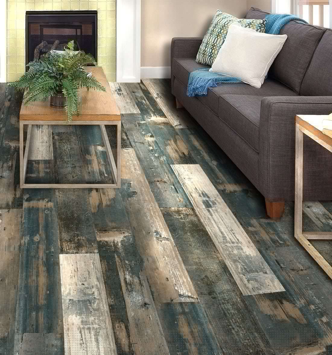 High-variation painted wood-look luxury vinyl planks for floor or wall installations. Flexible, glue-down design delivers waterproof durability and easy maintenance in residential or commercial spaces.