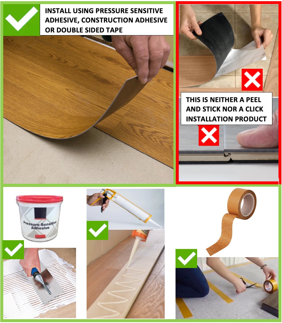 A: Glue-down using pressure-sensitive adhesive, construction adhesive, or double-sided tape; it is not peel-and-stick or click-lock.