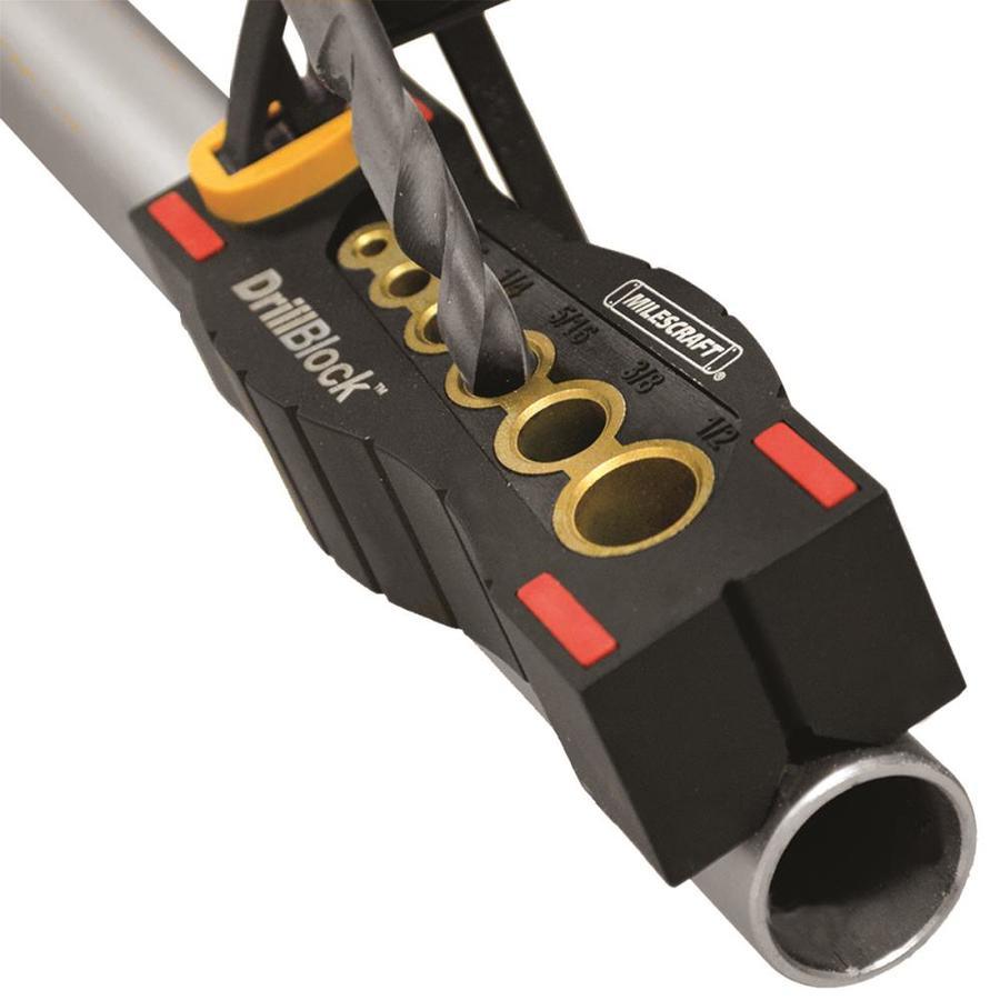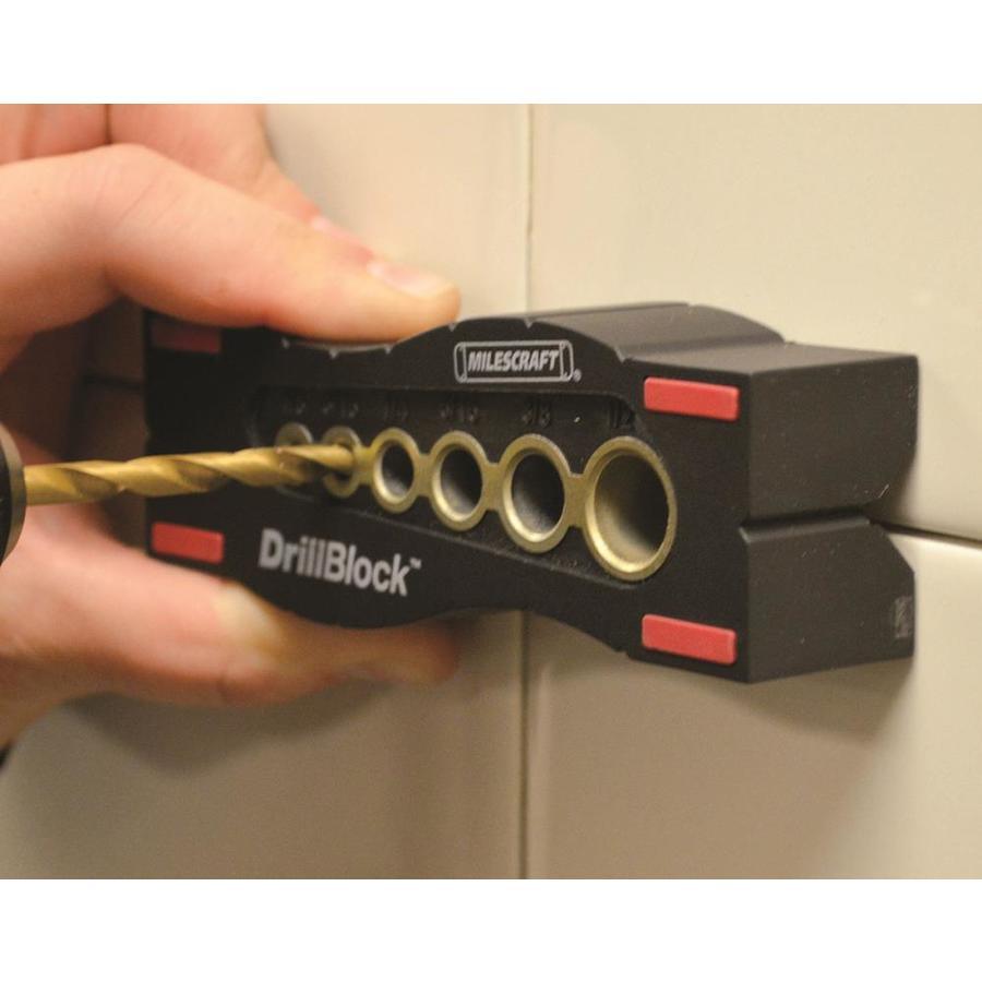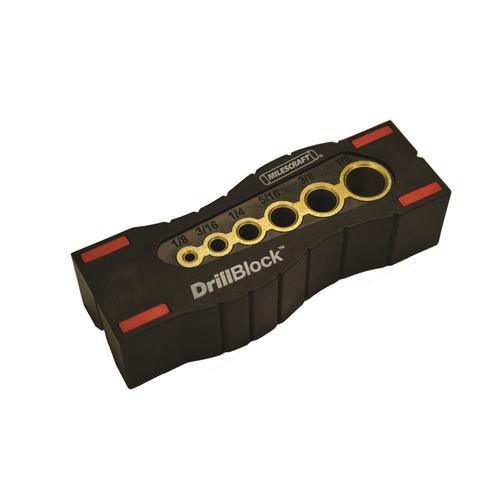 Built-in V-groove for drilling on cylindrical stock Six common drill bit sizes: 1/8 In., 3/16 In., 1/4 In., 5/16 In., 3/8 In. and 1/2 In Built-in vertical and horizontal centerlines for accurate alignment Non-slip feet, prevents slipping and marring on the work surface