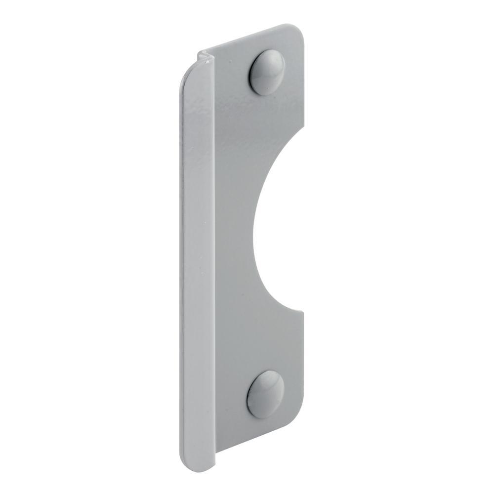 This latch shield is constructed of steel and comes in a gray painted finish. It features a 5/16 in. offset lip which is designed to cover the latch area of an outswinging hinged door. This latch shield helps protect swing-out doors from forced entry at the most vulnerable area of a door. Use this latch shield with doors whose locksets are installed at a 2-3/8 in. backset. Installation fasteners are included with this item.