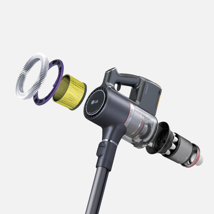 Two Batteries - The LG CordZero™ A9 Stick Vacuum’s rechargeable, detachable batteries let you clean and charge at the same time So Much More Than a Stand - Easily store and charge anywhere, anytime—without drilling holes into your wall Control Features With a Single Touch - Turn the vacuum on and off or change power levels with the touch of your thumb Removable Filters for Easy Maintenance - Extend the life of your vacuum with easy to maintain removable and washable filters Deep Clean Hidden Dust - The Power Punch nozzle pulsate to uncover hidden dust embedded in mattresses, sofas, upholstered chairs and more The 5-step filtration system helps to filter 99.99% of dust Adjust the telescopic handle for ease of use and storage The Smart Inverter Motor™ creates powerful 140AW suction Effectively lifts dust, dirt and pet hair from carpets