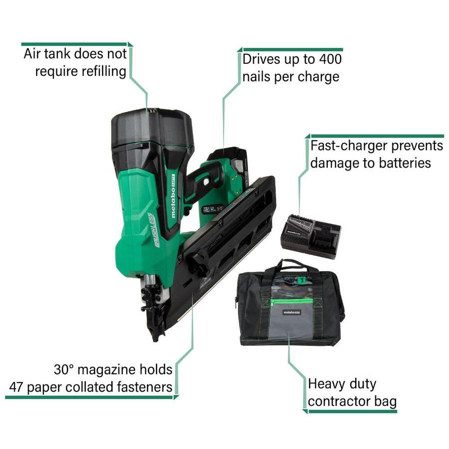 POWER: Drives 400 nails per charge using Metabo HPT's new compact 3.0 Ah Li-ion battery