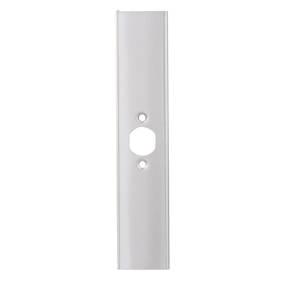 This is a solid brass door reinforcer in a stainless steel finish. This helps prevent a forced entry. Typically used on wood or metal doors that are 1-3/4 in. thick with mortise or drive-in latches. Accommodates key-in knob locksets or deadbolts, or combination locksets. It features one 2-1/8 in. bore with a 2-3/8 in. backset. Dimensions are 3-7/8 in. wide and 9 in. tall.