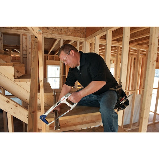 Professional-grade hacksaw frame engineered with a rigid I-beam for ultra-high blade tension up to 50,000 PSI, delivering fast, straight cuts. Rubberized grips provide control in wet or cold conditions, and the frame stores extra blades with no tools required.