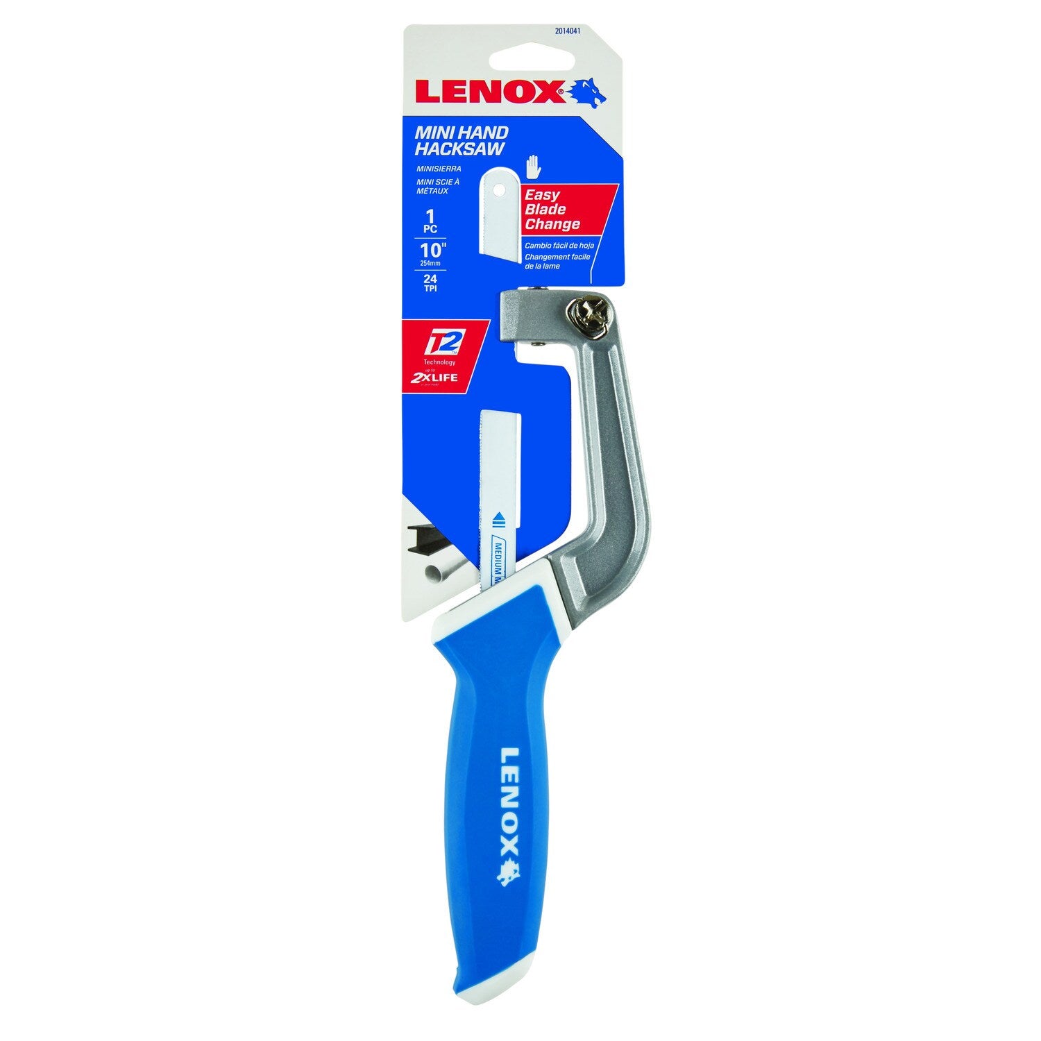 Compact LENOX mini hacksaw designed for tight spaces with an ergonomic grip and tool-less blade changes. Includes a 10-in, 24 TPI bi‑metal blade and accepts 10-in or 12-in blades for versatile cutting on metal and plastics.