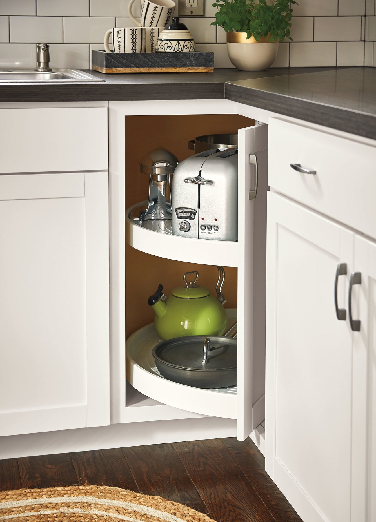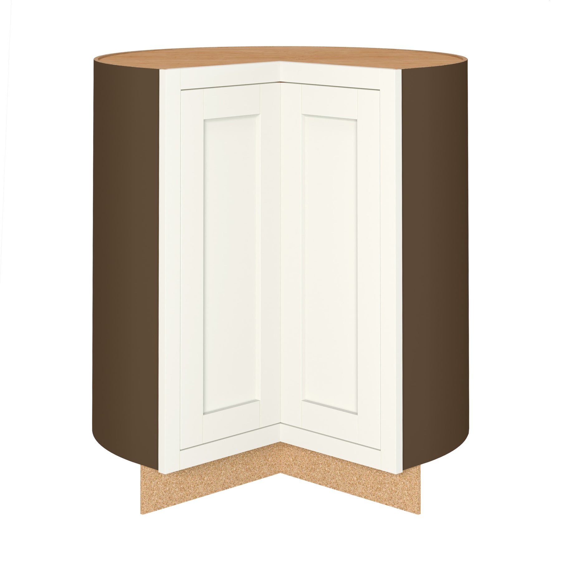 This fully assembled Diamond NOW Arcadia corner base cabinet maximizes storage with two Lazy Susan shelves. Durable TrueColor white laminate over engineered wood offers an easy-clean, scuff-resistant finish with a modern full-overlay shaker door.