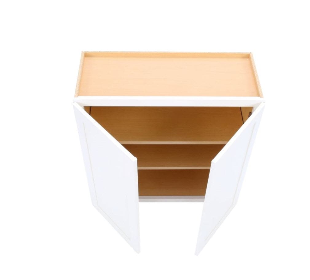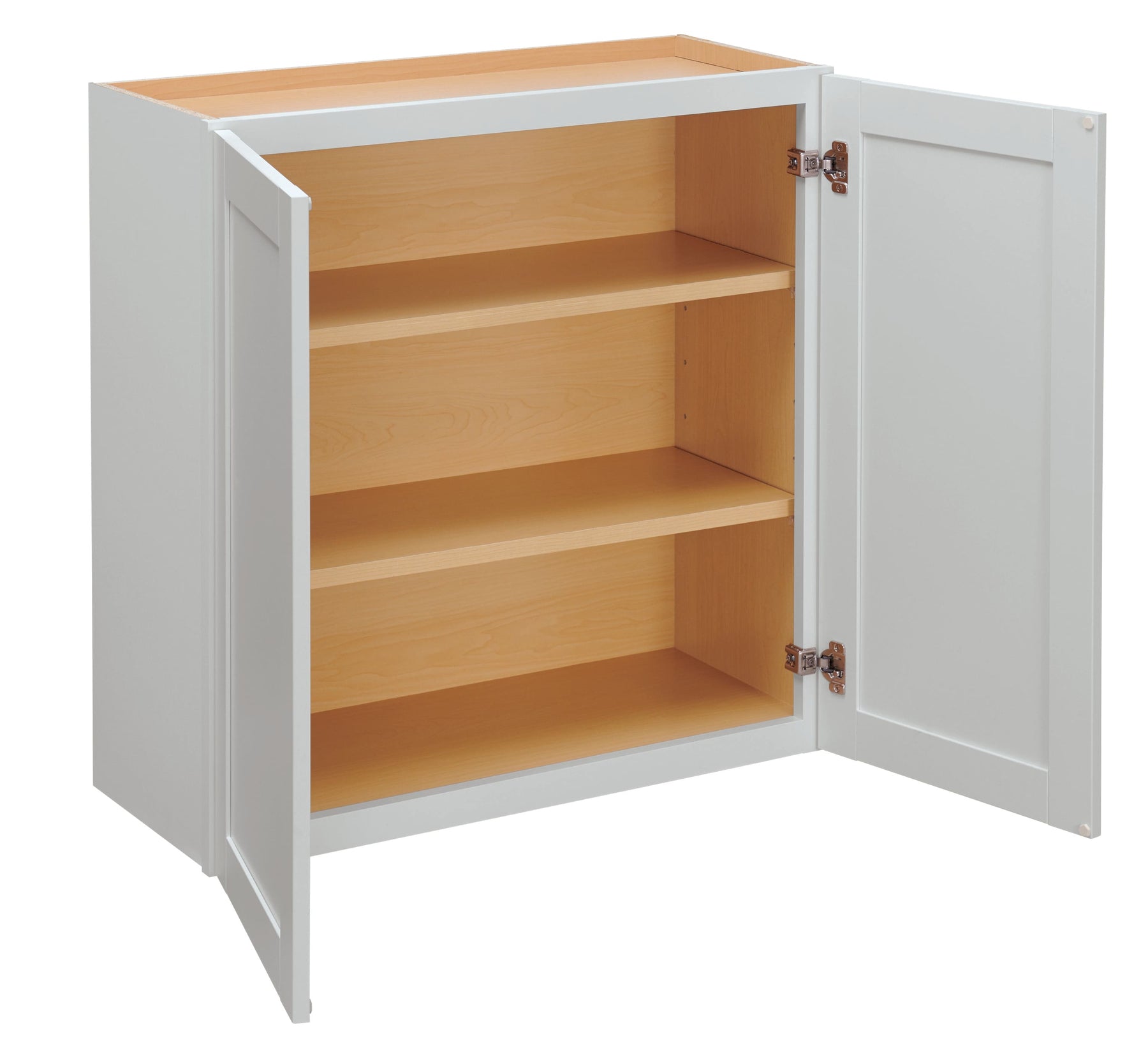 Fully assembled wall cabinet with recessed Shaker-style doors in durable TrueColor white laminate. Engineered wood construction with solid back panel and I-beam braces for easy installation and long-term stability.