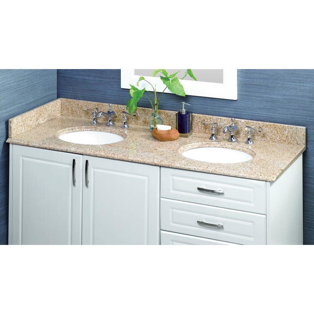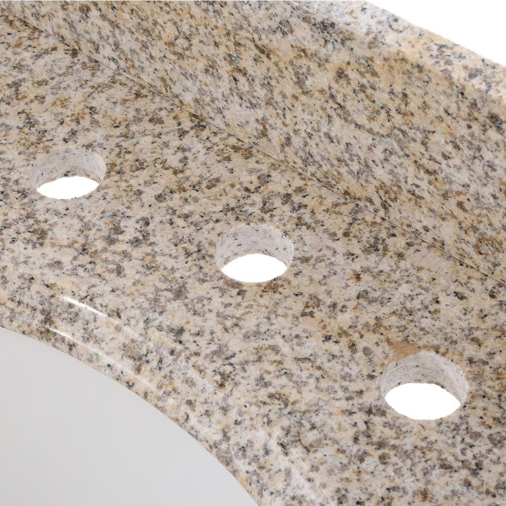 Upgrade your bathroom with the natural resplendency of granite in this Granite Vanity Top from Pegasus. Two white porcelain sink bowls are affixed to the underside, encircled at the surface by a beveled counter edge that projects a classically appealing design. This bathroom countertop includes 8 in. widespread faucet holes pre-drilled and ready for the fixtures of your choosing. The timeless beauty of earth-harvested stone is sure to infuse style and sophistication into your space, while the durability of granite ensures years of lasting use. To complete the look and help protect your wall from water damage, a matching beige granite backsplash is also conveniently included.