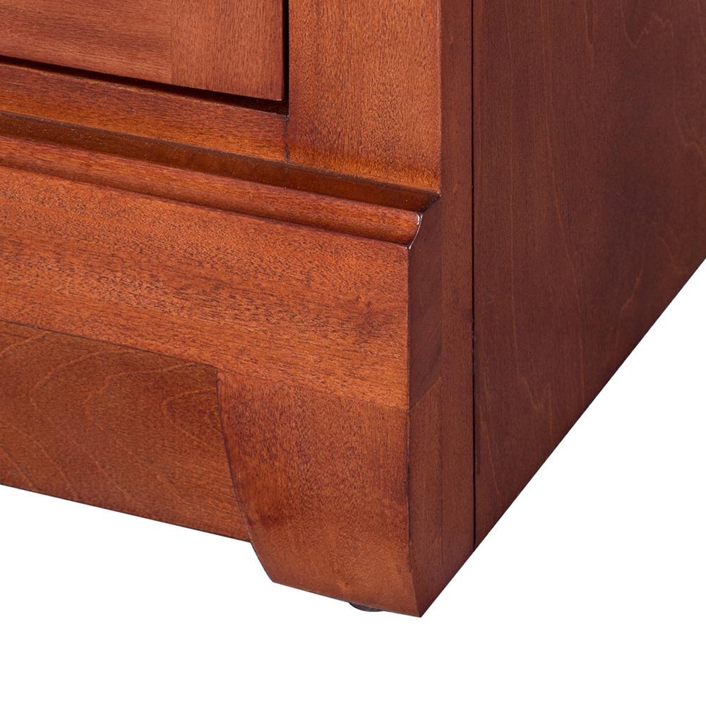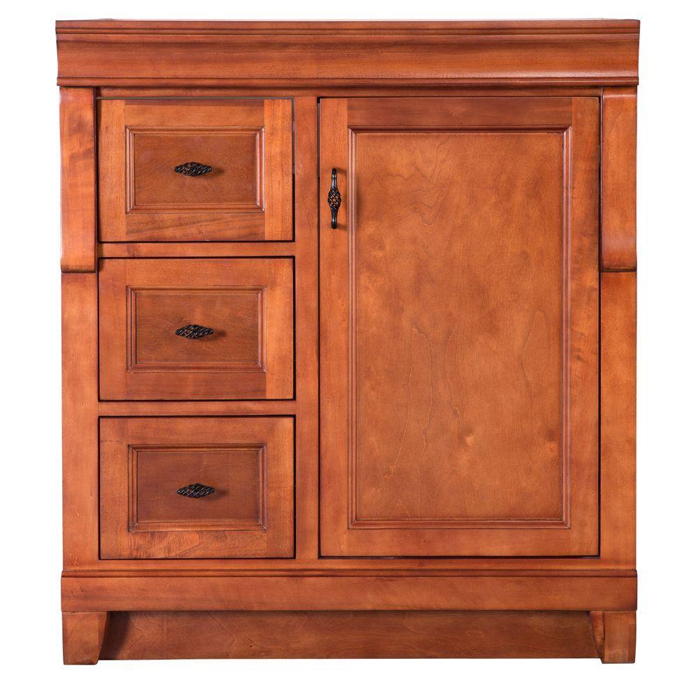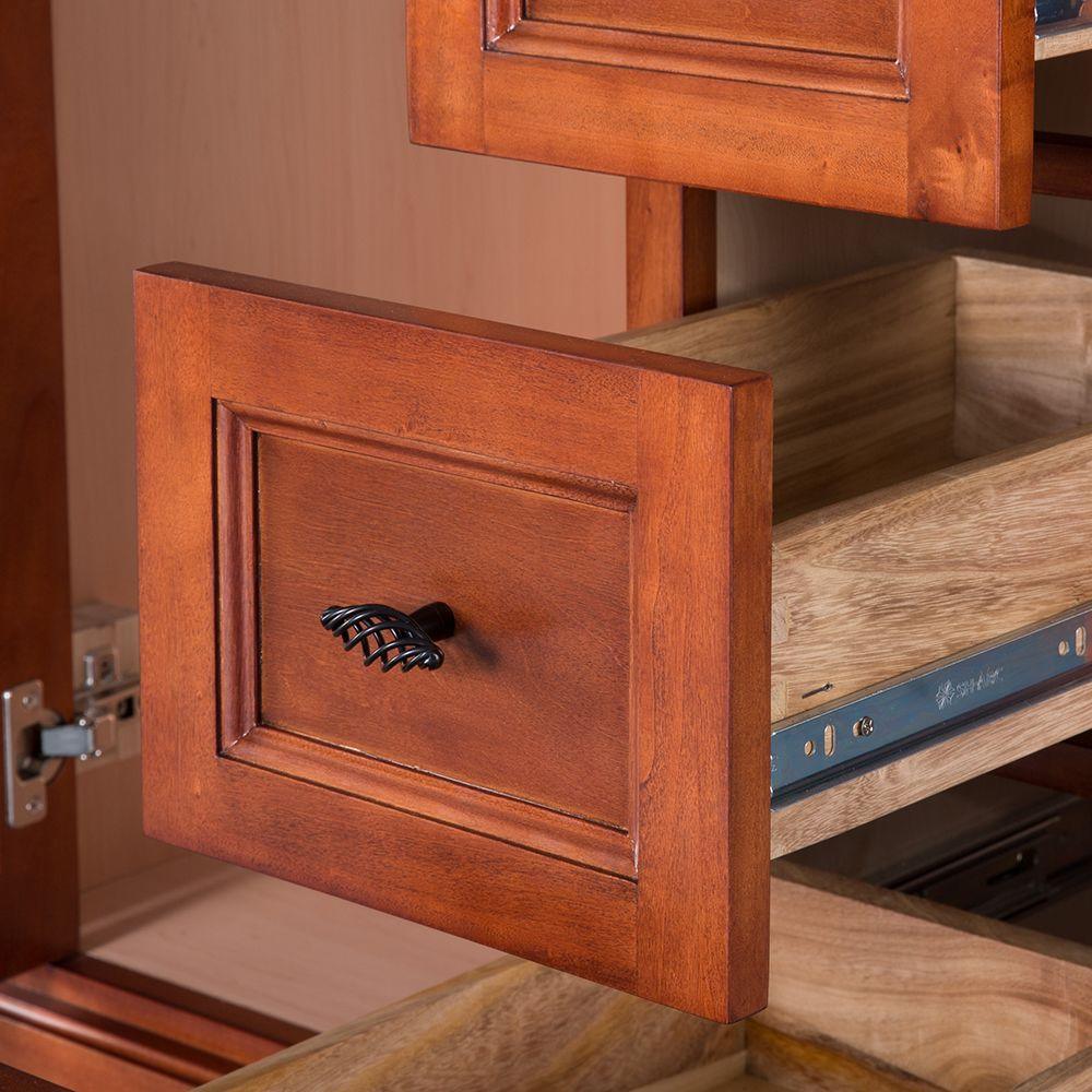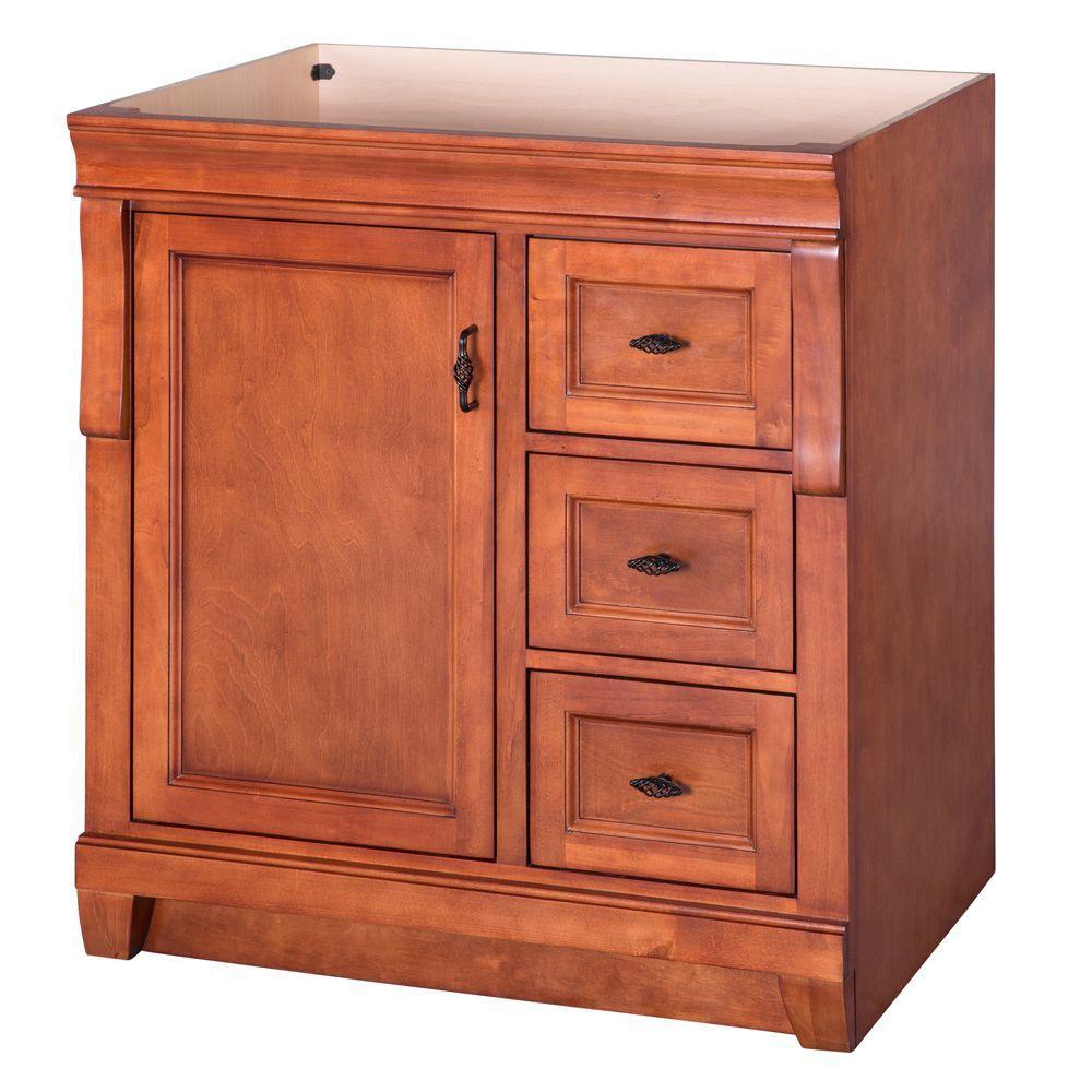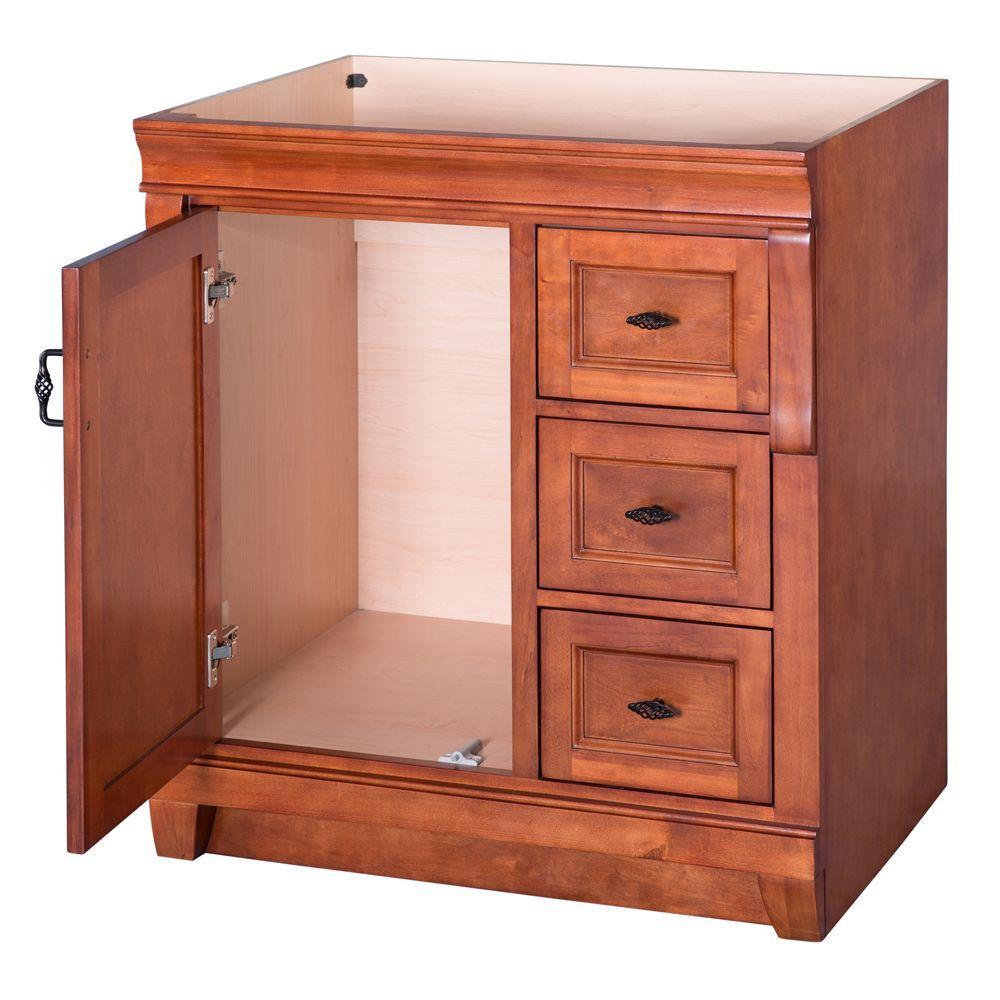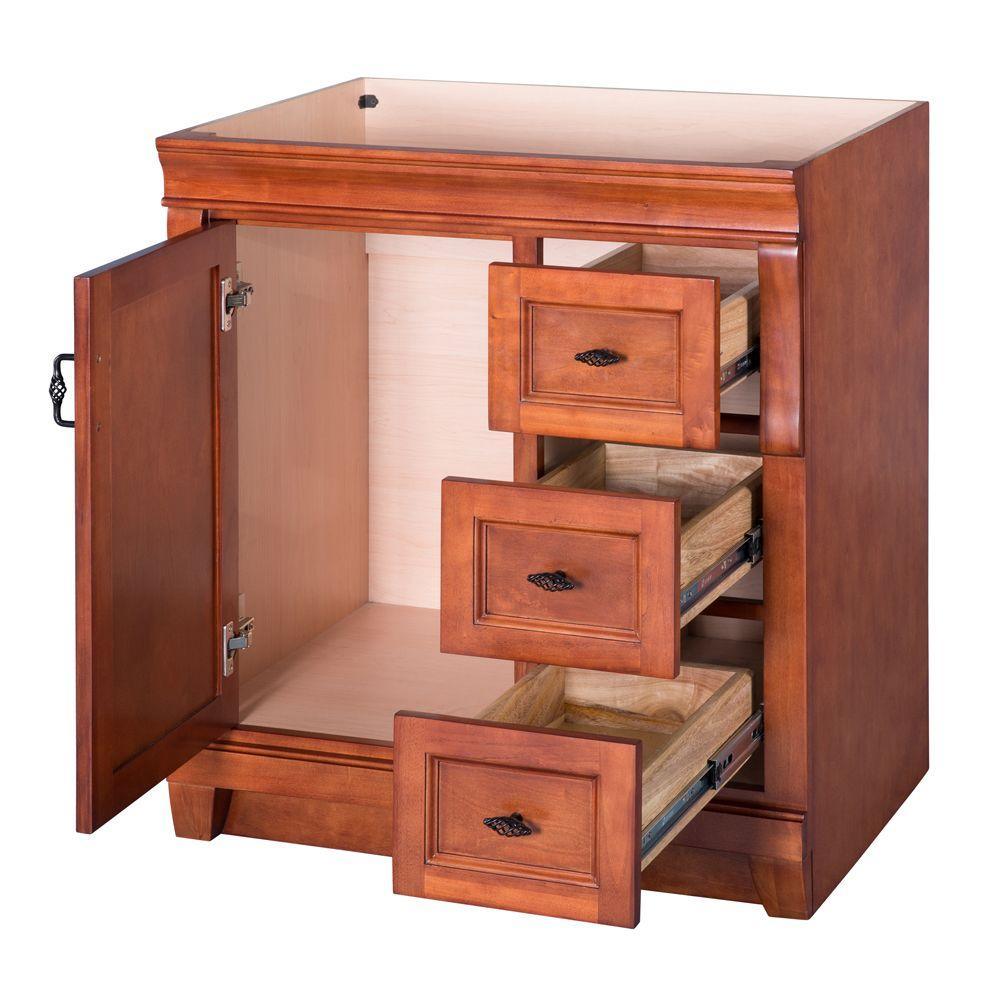 Awash with a warm cinnamon finish, this 30 in. vanity cabinet is full-bodied and sits flush with the floor. It is an attractive, elegant piece with an affordable price that belies its upscale look. One large inset cabinet door and three right-side drawers are equipped with black birdcage-style handles that give it a vintage appearance. The solid, seamless construction gives homeowners and contractors the sense that it is custom-built, while the generous storage space within accepts bathroom accessories aplenty. Cap this furniture-style bathroom vanity with a top/sink/faucet combination that ties the room together. Browse the Foremost Naples lineup for mirrors and wall/linen cabinets in the same cinnamon finish.