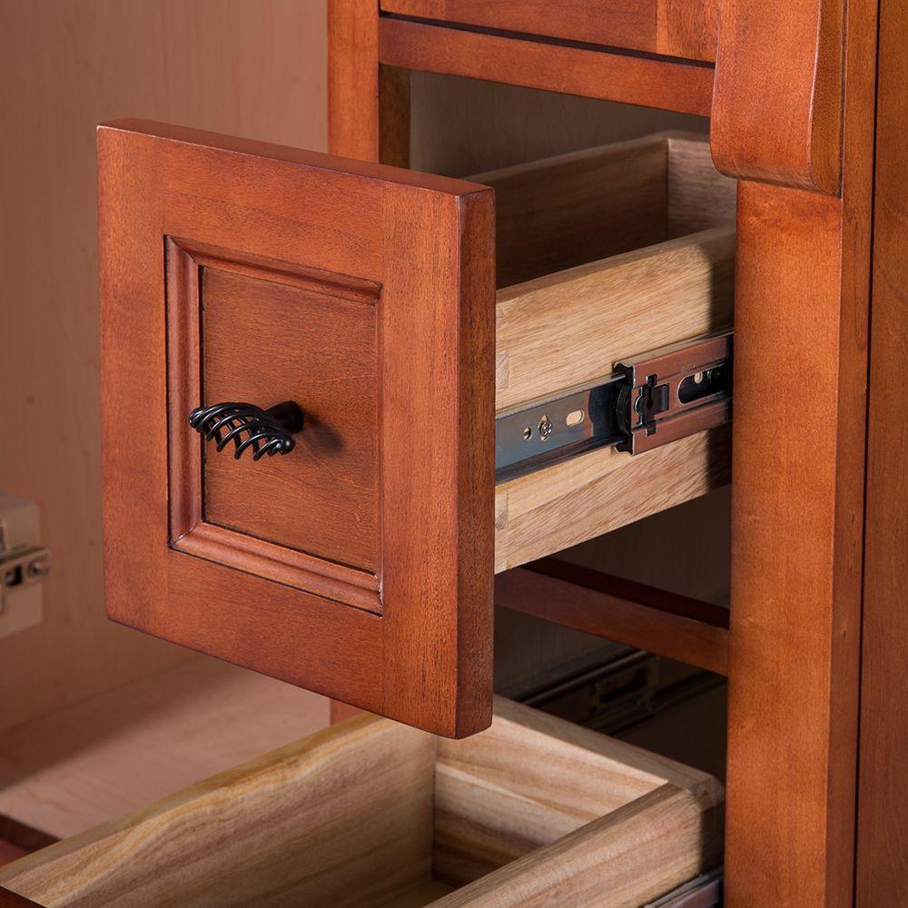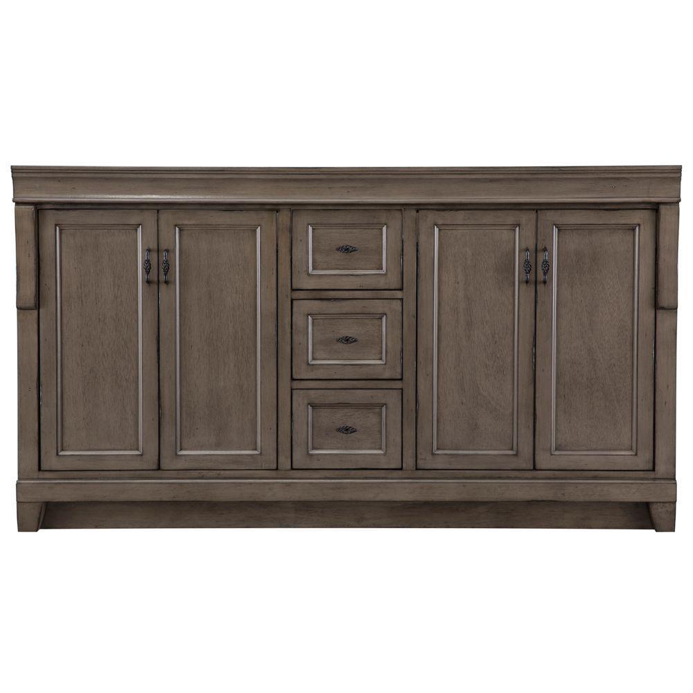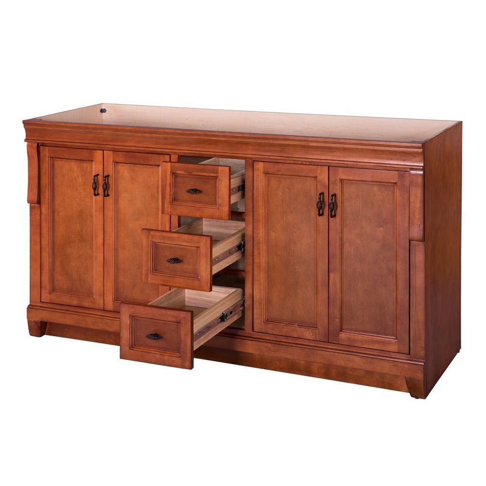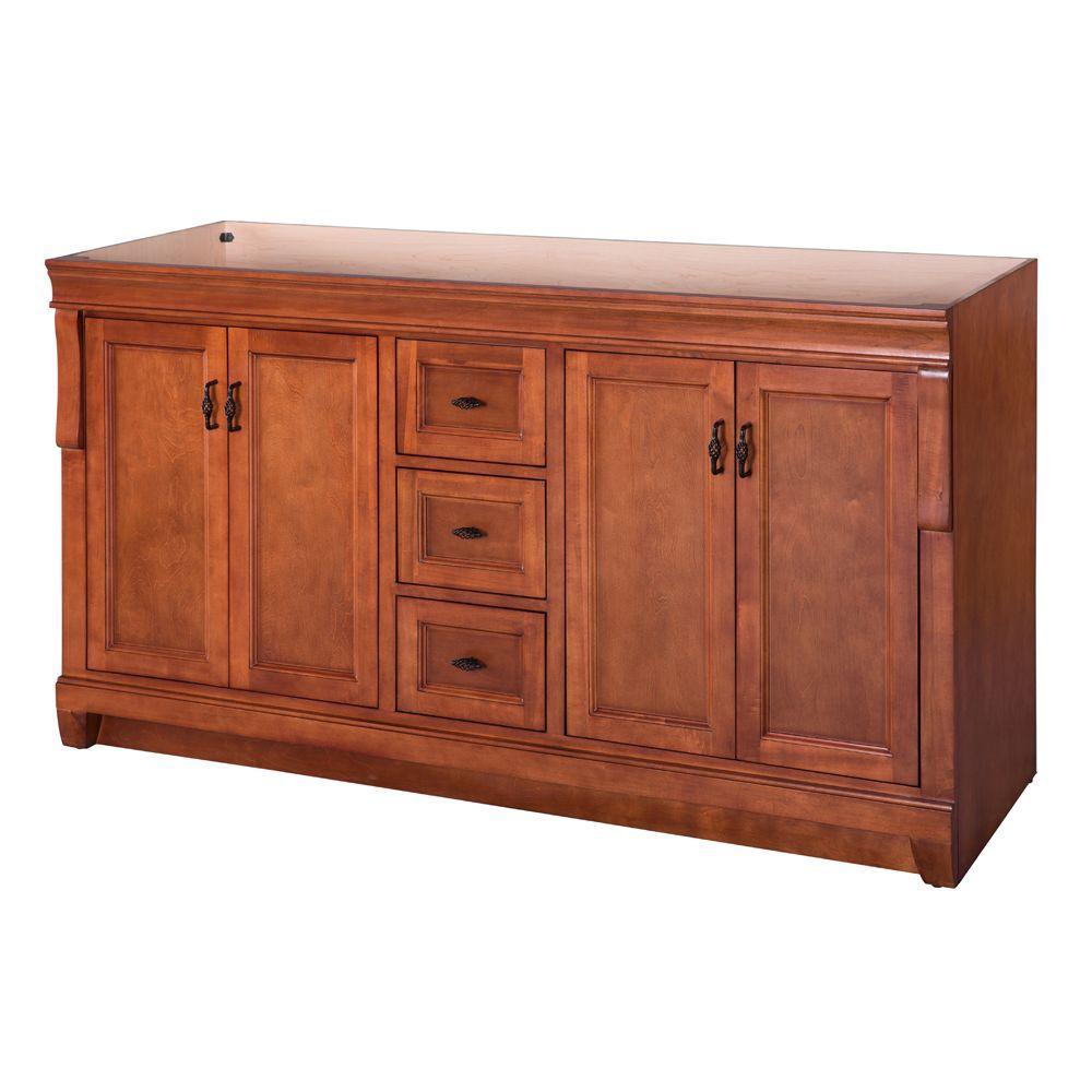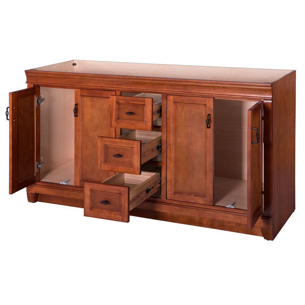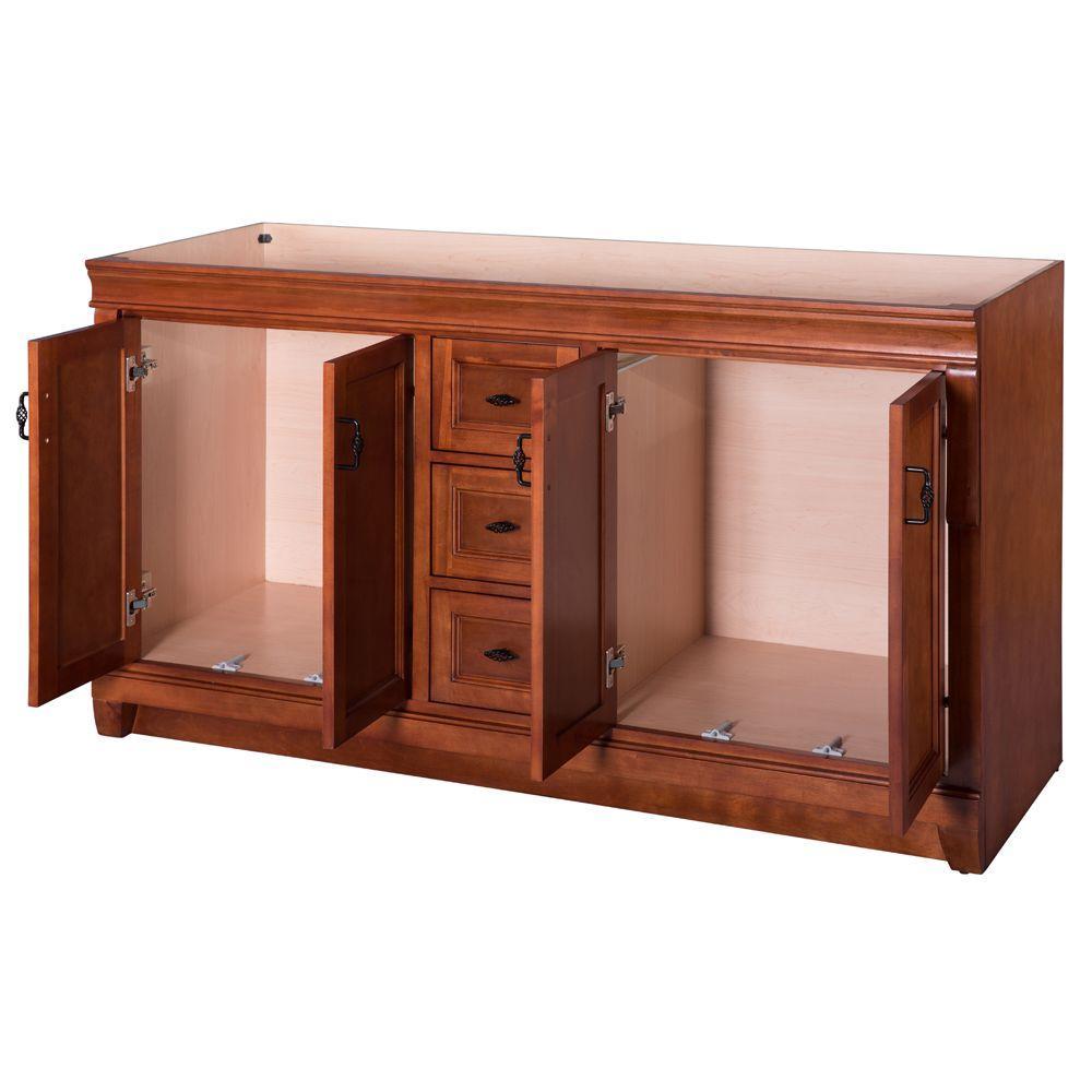 Awash with a warm cinnamon finish, this 60-in. double vanity is full-bodied and sits flush with the floor. It is an attractive, elegant piece with an upscale look. Two sets of double doors, one right and one left, and three middle drawers are equipped with black birdcage-style handles that produce a vintage appearance. The vanity's solid, seamless construction gives homeowners and contractors the sense that it is custom-built, while the generous storage space within accepts bathroom accessories aplenty. Cap this furniture-style bathroom vanity with a top-sink-faucet combination that ties the room together. Browse the Foremost Naples lineup for mirrors and wall-linen cabinets in the same cinnamon finish for a complete look.