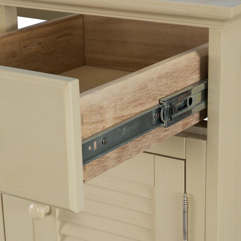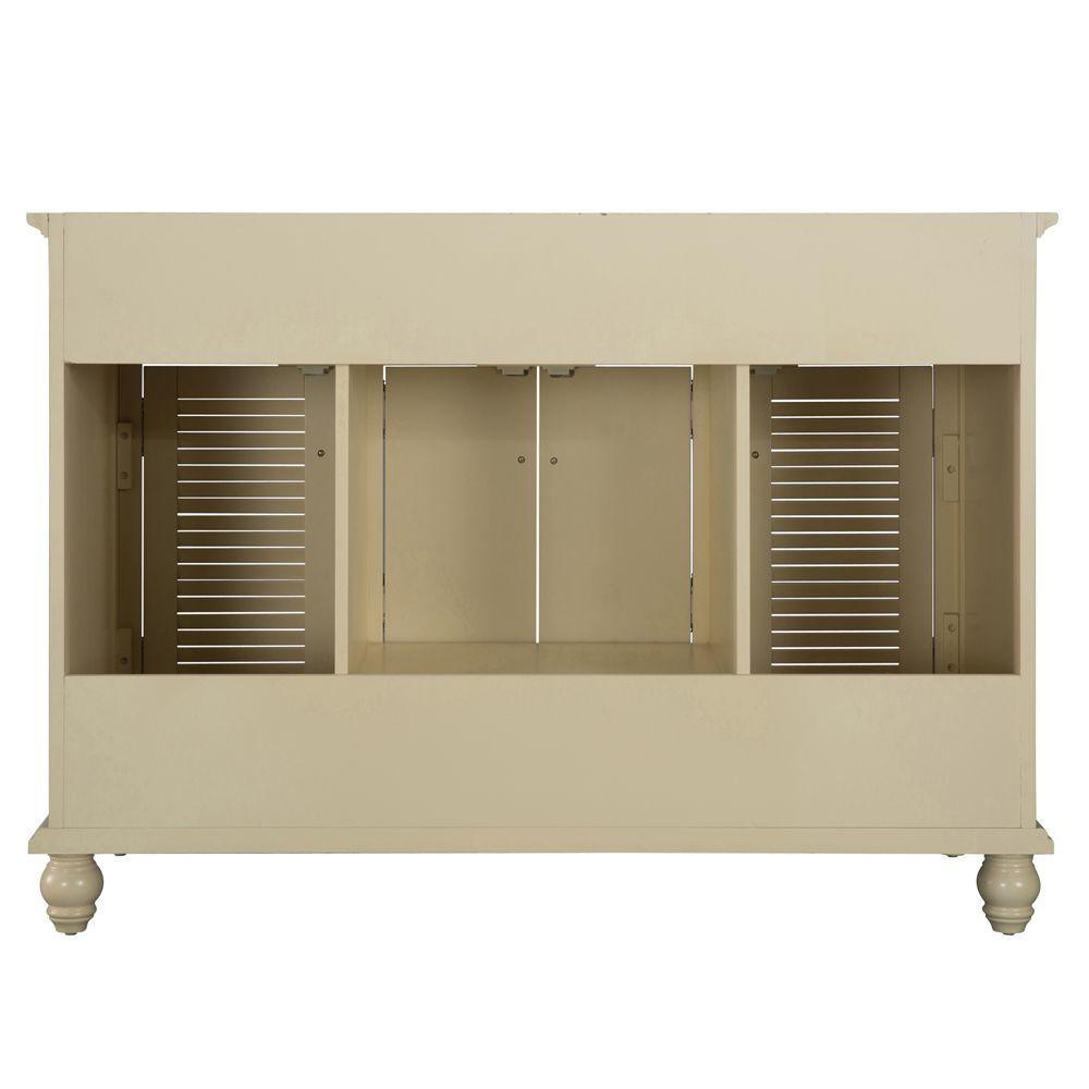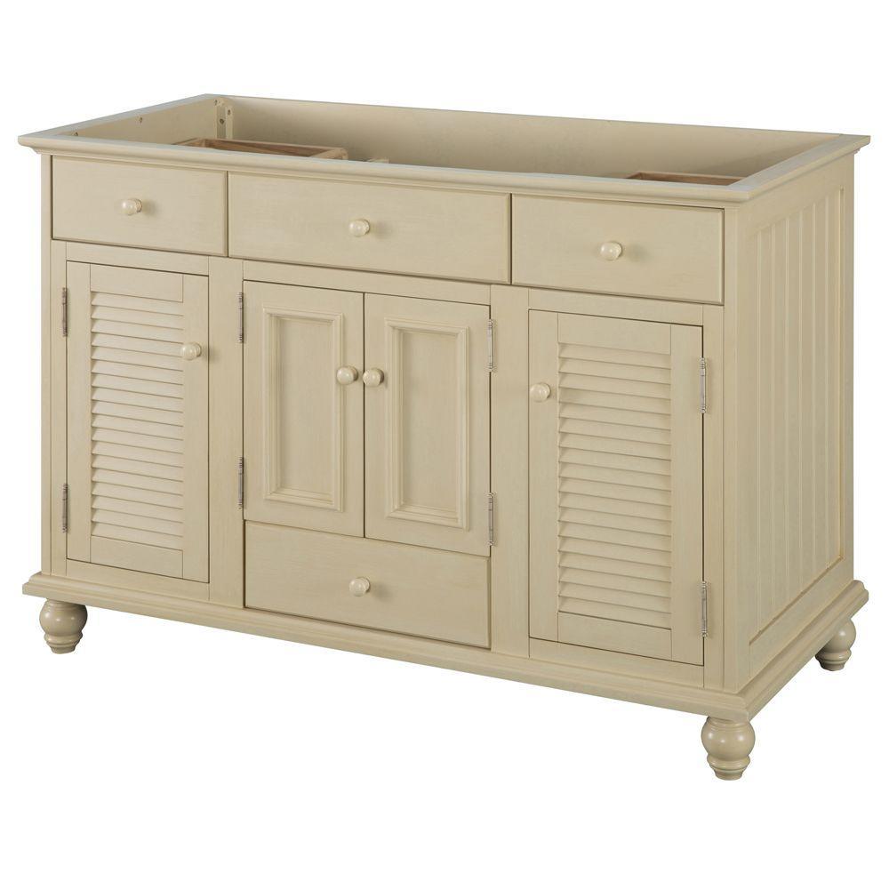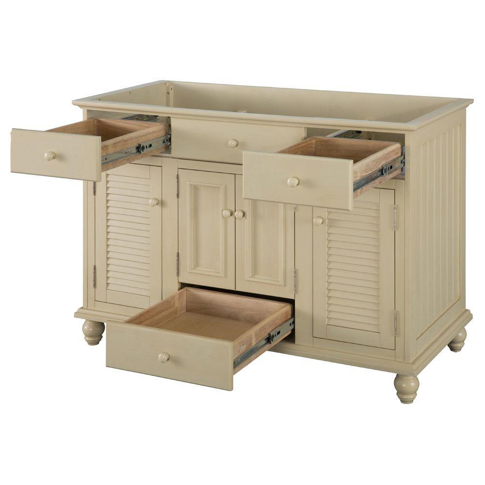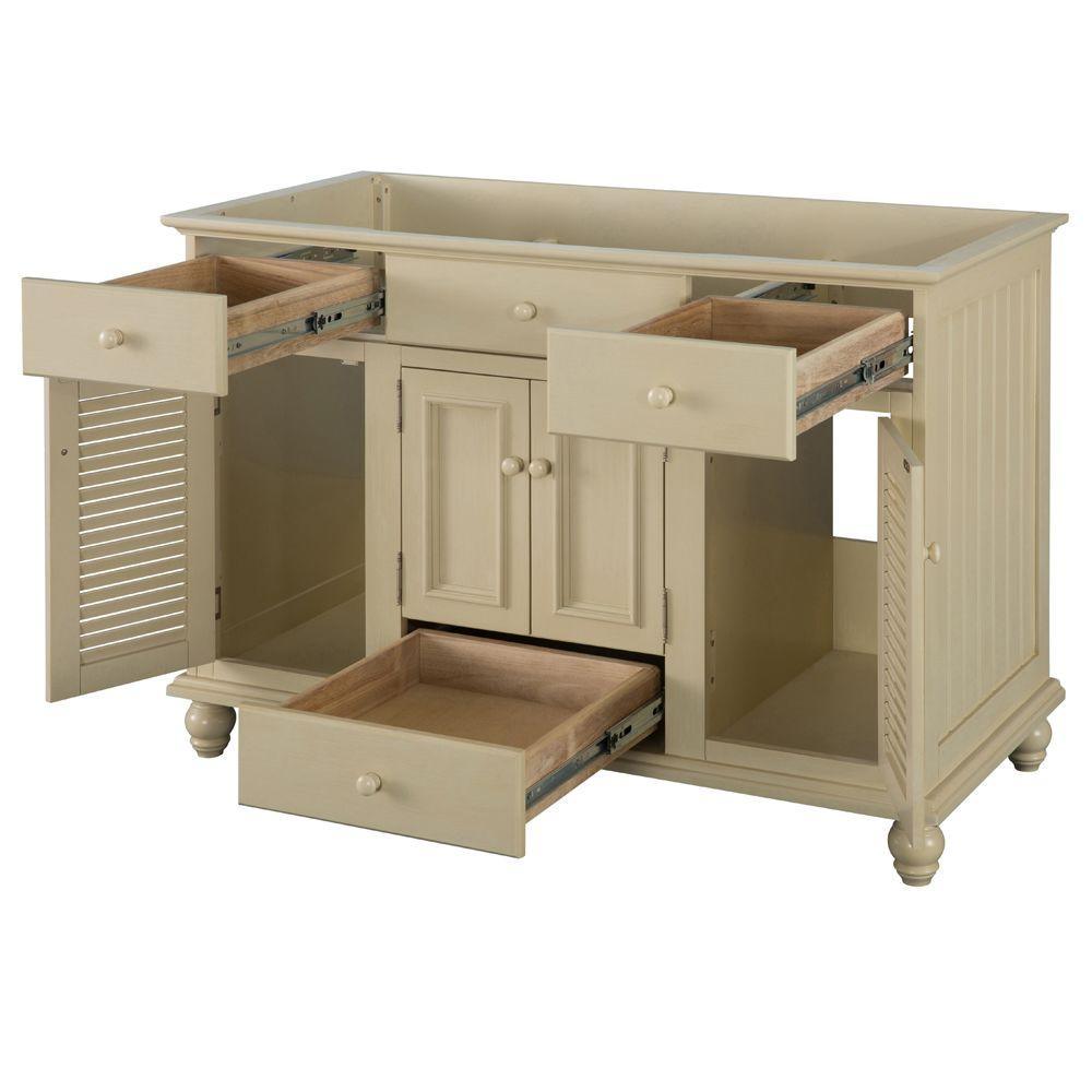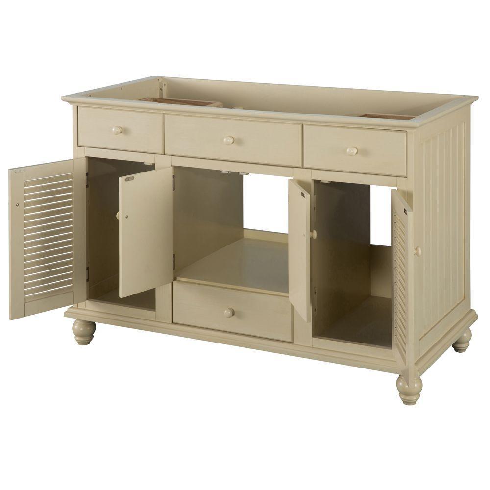 With beadboard-style side panels and louvered outer doors, this vanity cabinet will give your bathroom the look and feel of a rustic cottage. The antique white finish on this piece evokes cleanliness and calmness, bringing a sense of tranquility to your home. At 48 in. W, this vanity is an ideal size for homeowners who desire plentiful countertop surface area in their bathroom. A fully extending bottom drawer adds to the ample storage space you'll find behind the two doors above and a door on each side. Explore the Foremost Cottage collection for wall/floor/medicine cabinets and wall mirrors in the same style.