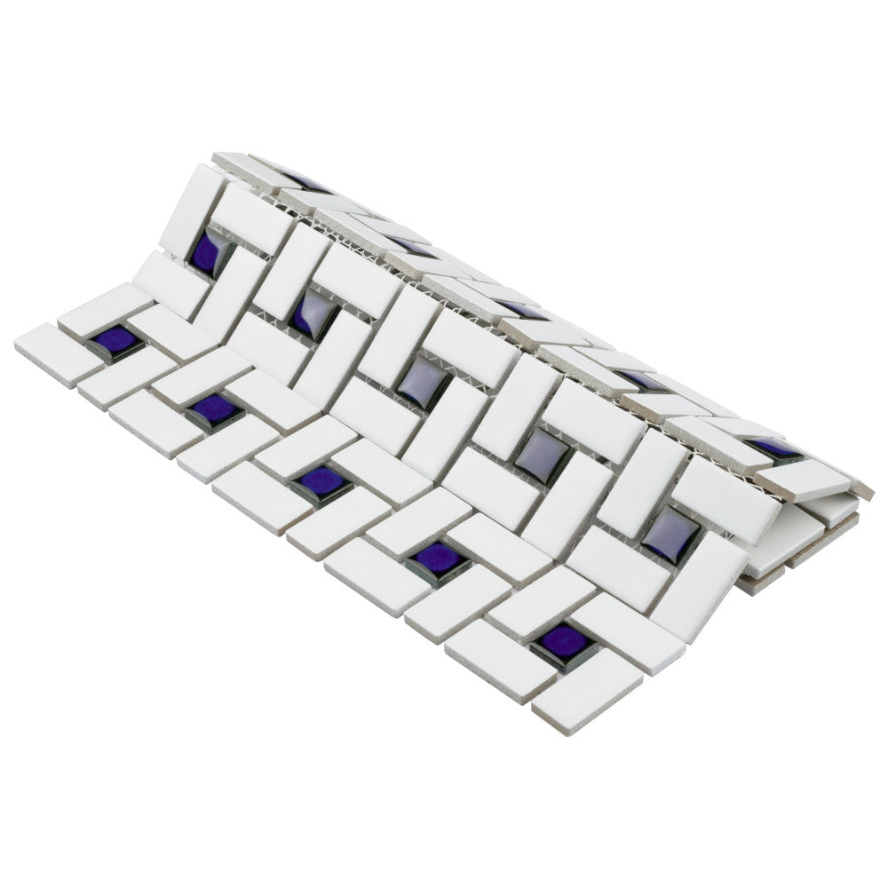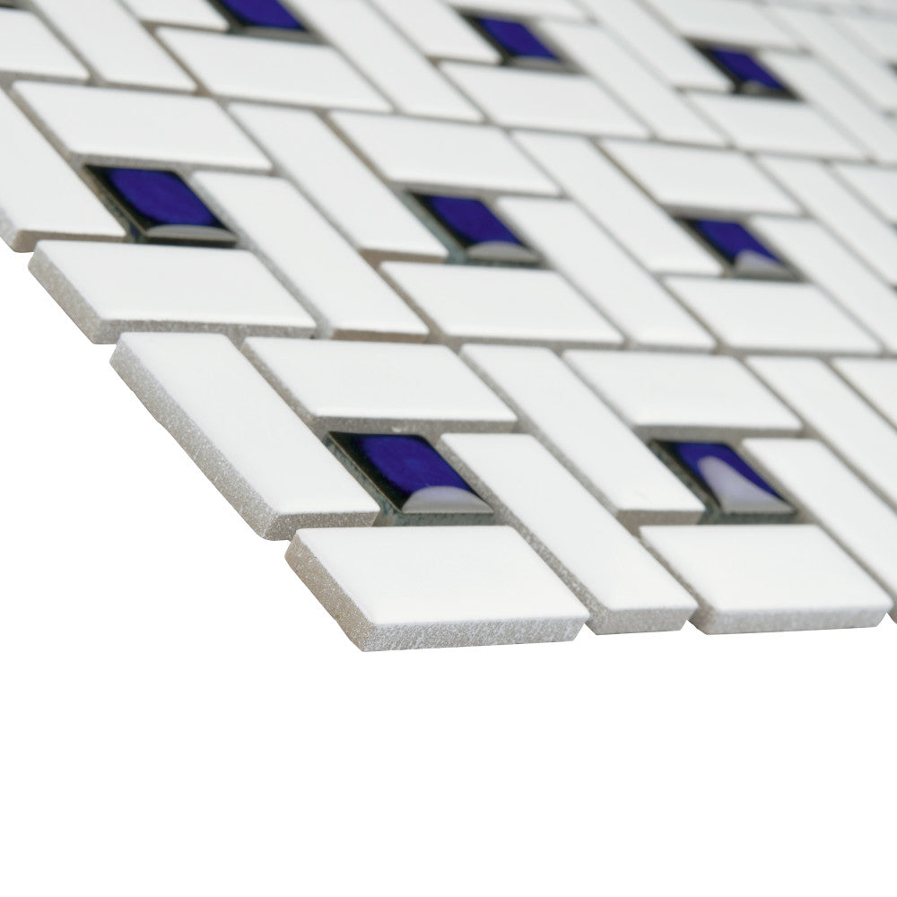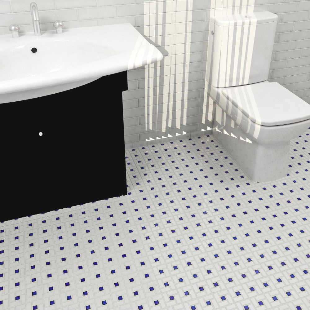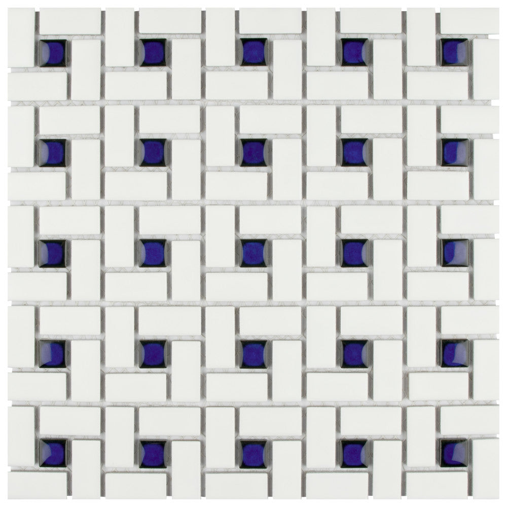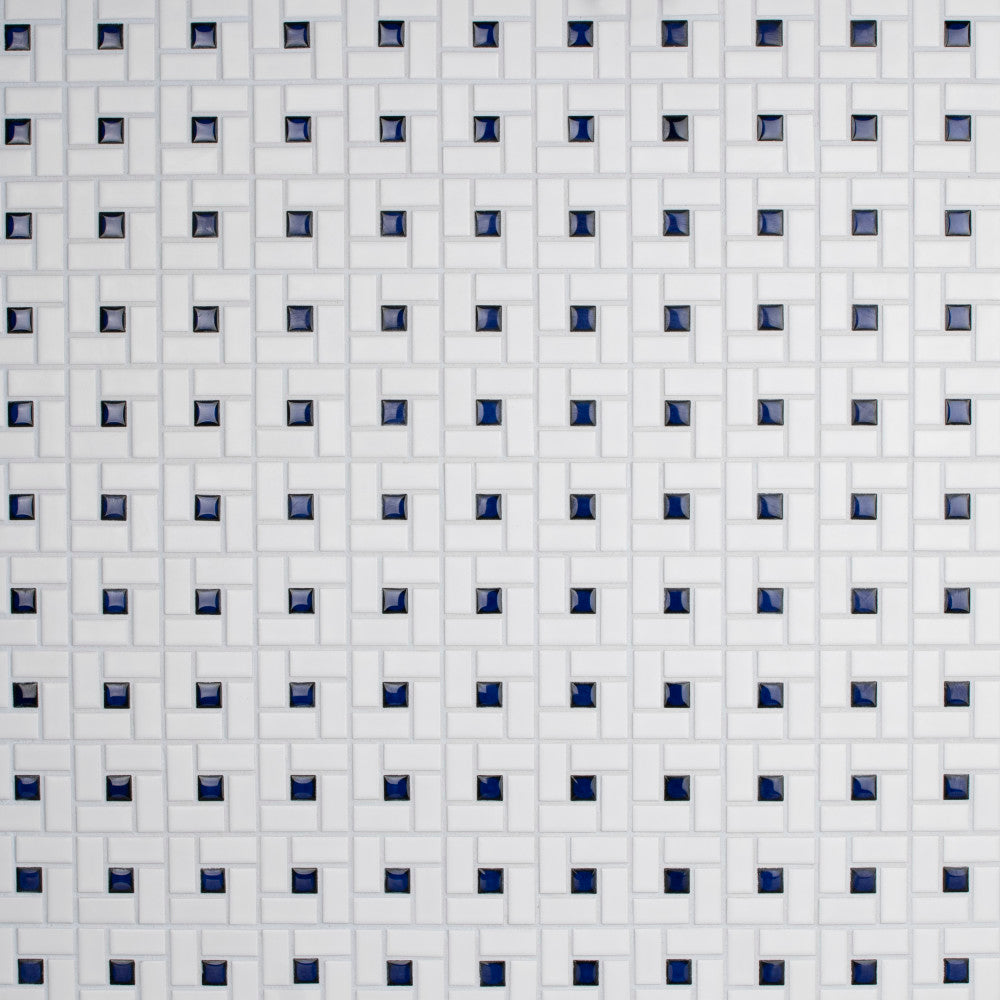 Porcelain floor and wall mosaic featuring a pinwheel pattern of white pieces with blue accents. Impervious, frost-resistant, and suitable for indoor/outdoor residential or commercial installations.