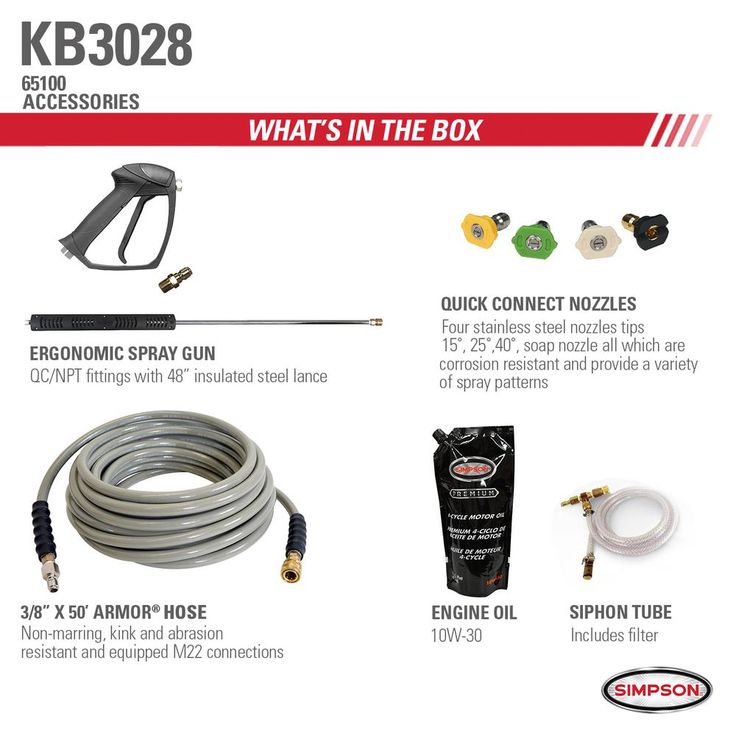4 Quick connect nozzle tips: 15°, 25°, 40° and soap to use for a variety of cleaning applications