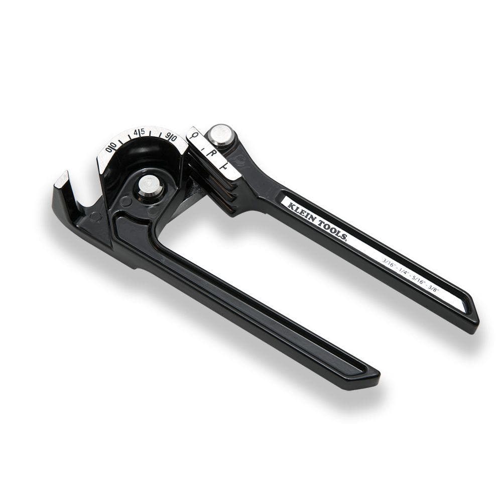 The Professional 90 Degree 4-in-1 Tube Bender by Klein Tools is expertly engineered to effectively bend soft copper, aluminum, and steel tubing. It accommodates the most commonly used tube sizes, including 3/16 in., 1/4 in., 5/16 in., and 3/8 in., and is equipped to accurately produce left-hand, right-hand, and offset bends up to 90 degrees. This bender features a lever-type design and is color-coded in black and chrome for easy identification.