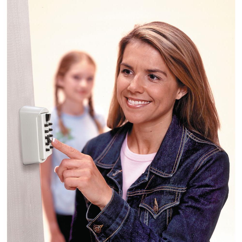 The Kidde Slimline KeySafe holds 2 keys and attaches securely to any wall or flat surface. The pushbutton combination lock is convenient and easy-to-use. You can change your code anytime for added security. This lock box features solid, weatherproof metal construction and is ideal for after-school access for children, as well as for family or emergency personnel.
