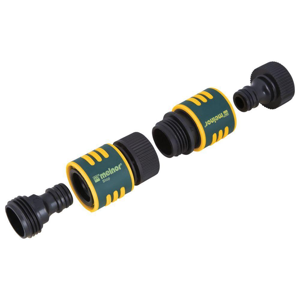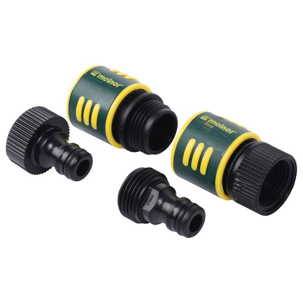 The Quick Connect Deluxe Hose Connector Set features 2 hose connectors, a product adapter and a faucet adapter. This complete Quick Connect System attaches the female end of a hose to a faucet and the male end of a hose to accessories. All pieces are made of durable ABS and are suitable for outdoor use.