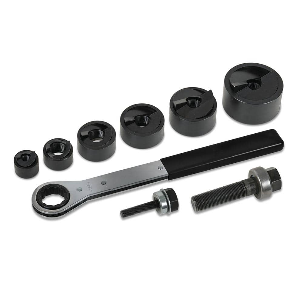 Complete Kit: Six knockout punches and dies, two draw studs, and 1-inch ratcheting wrench in carry case