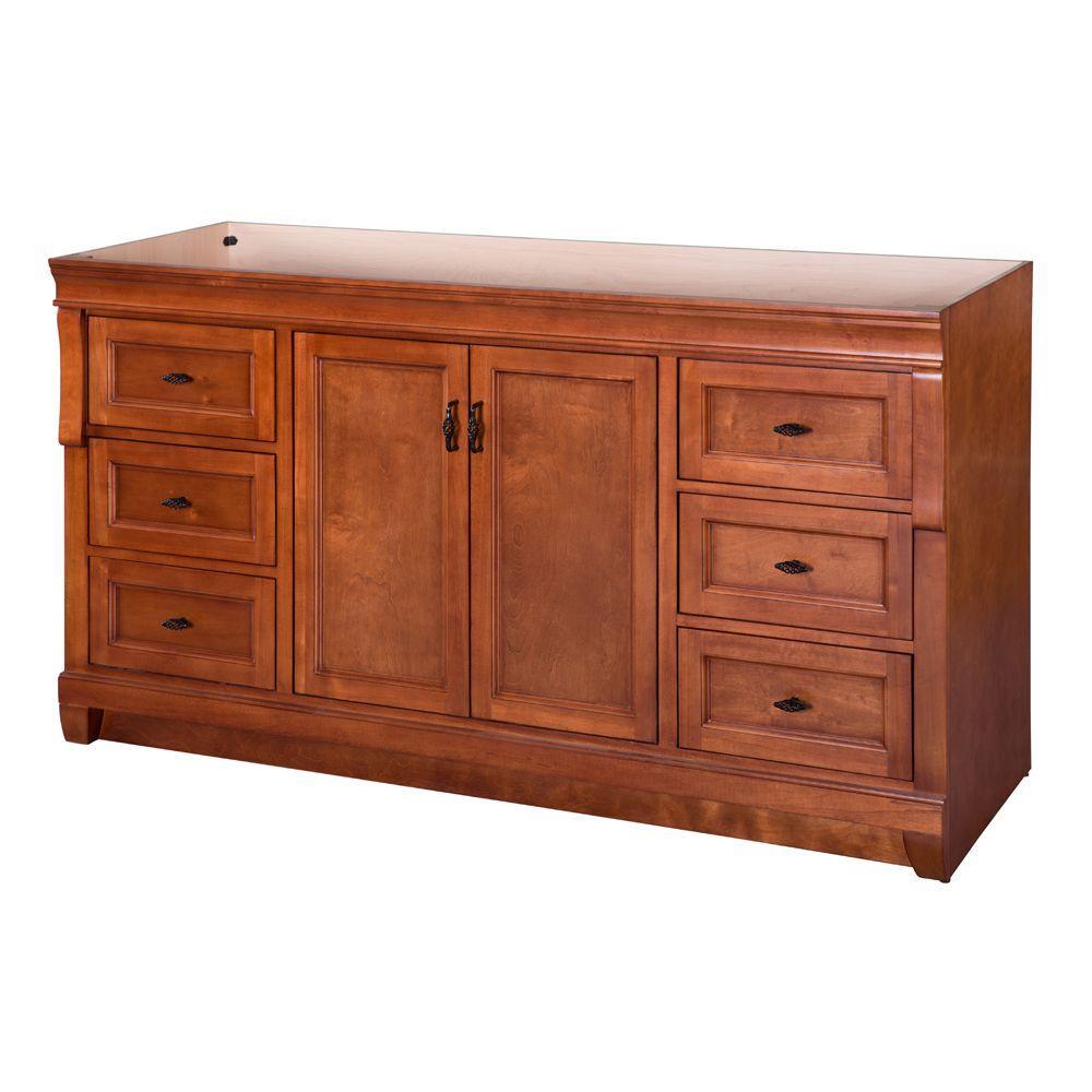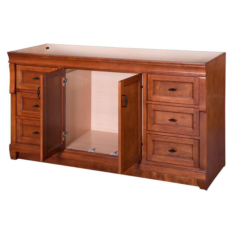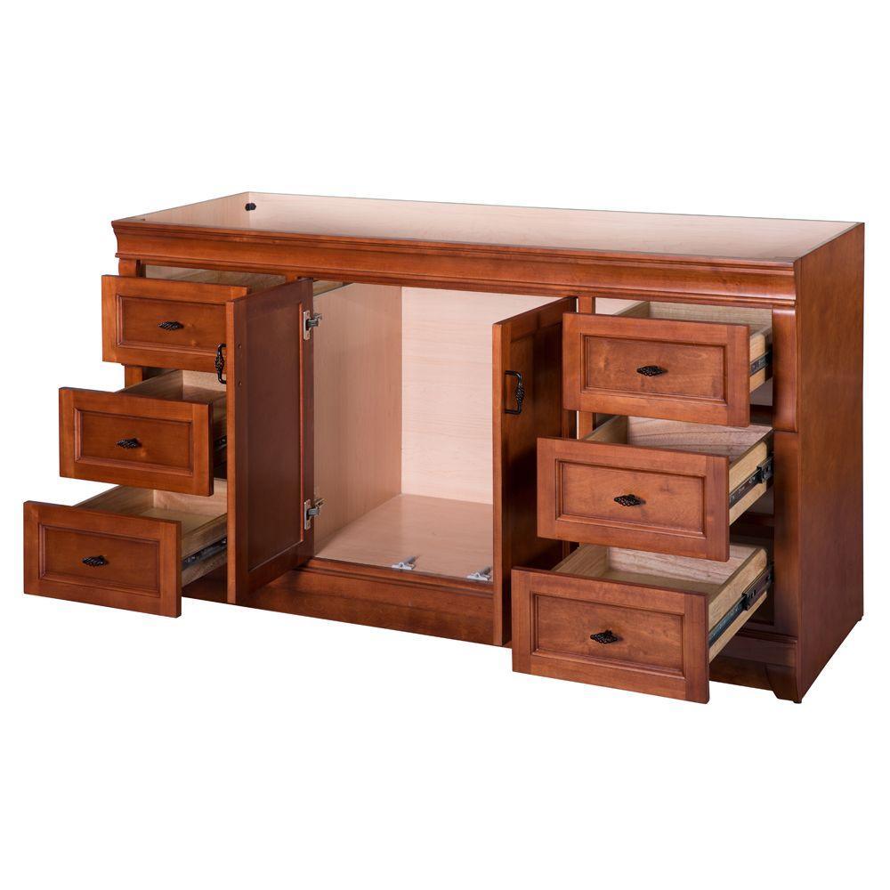 Awash with a warm cinnamon finish, this 60 in. single-bowl vanity is full-bodied and sits flush with the floor. Two large center doors and six outer drawers (three right, three left) are equipped with black birdcage-style handles that give it a vintage appearance. The solid, seamless construction gives homeowners the sense that it is custom built, while the generous storage space within accepts bathroom accessories aplenty. Cap this furniture-style bathroom vanity with a top/sink/faucet combination that ties the room together. Browse the Foremost Naples lineup for mirrors and wall/linen cabinets in the same collection.