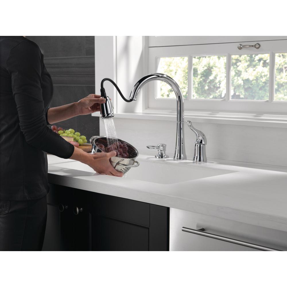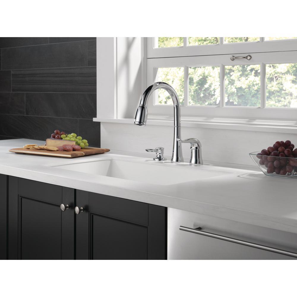 Clean styling and simple lines define the Delta Kate Single-Handle Pull-Down Sprayer Kitchen Faucet in Chrome. It's equipped with MagnaTite docking that keeps the pull-down spray wand firmly in place with a powerful integrated magnet. It also features DIAMOND Seal Technology that reduces the chance of water coming in contact with potential metal contaminants once inside the faucet. This results in cleaner water for you and your family.