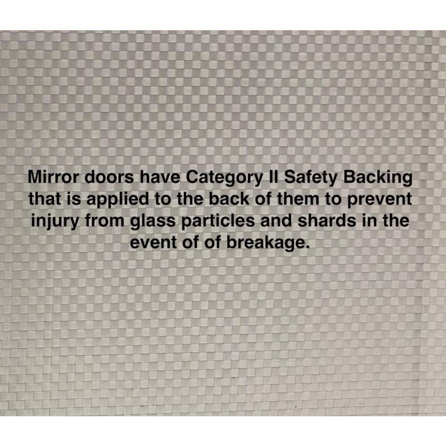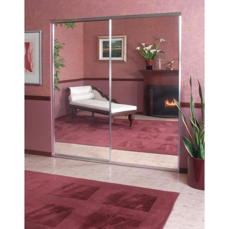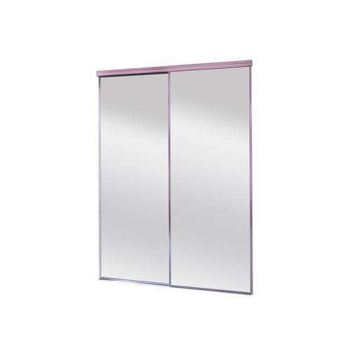 Bright chrome aluminum frame construction Fits openings that are 56-in. to 60-in. in width Fits openings that are 80-in. to 81-in. in height Includes (2) 30.625-in. x 78.125-in. panels, track set and installation hardware Adjustable for out-of-square openings Package includes all hardware and fasteners Category II safety backed mirror Low rise bottom track for minimal floor obstruction Top and bottom track are prefinished to match door