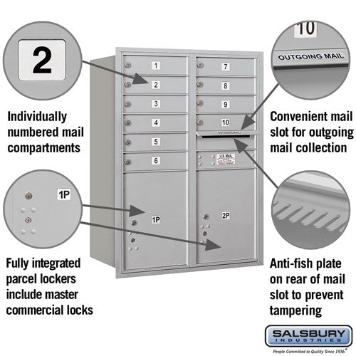 This recessed-mounted mailbox unit features 10 mail compartments and 2 parcel lockers, designed for private access and rear loading. Constructed from heavy-duty aluminum with a durable powder-coated finish, it ensures security and longevity.