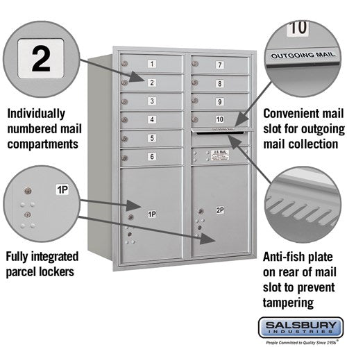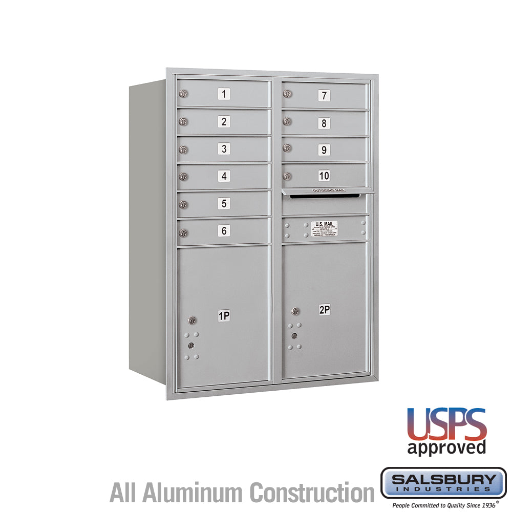 This recessed mounted mailbox unit features 11 compartments and 2 parcel lockers, designed for USPS access and rear loading. Constructed from heavy-duty aluminum with a durable powder-coated finish, it is ideal for residential and commercial use.