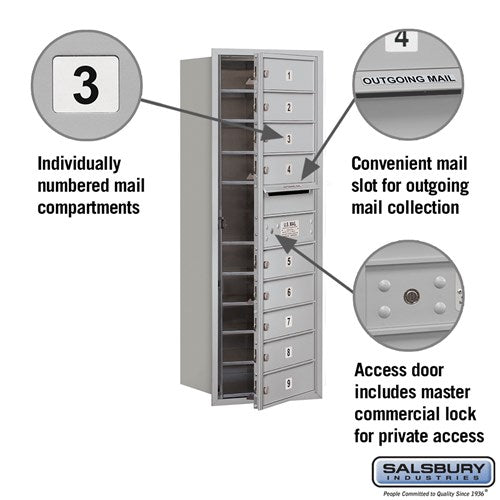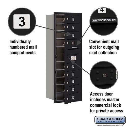 This 11-door high recessed mounted mailbox is designed for private access and front loading, featuring durable aluminum construction and a sleek black powder-coated finish. Ideal for secure mail storage in various settings.