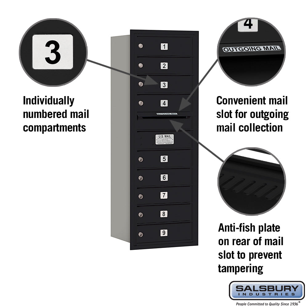 This recessed-mounted 4C horizontal mailbox features 11 tenant doors and a durable black powder-coated finish. Designed for USPS access, it is ideal for apartments, commercial buildings, and residential developments.