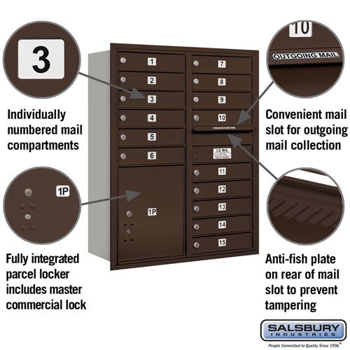 This recessed-mounted mailbox unit features 15 mail doors and 1 parcel locker, designed for private access and rear loading. Constructed with heavy-duty aluminum and stainless steel hardware, it offers durability and security for indoor or outdoor use.