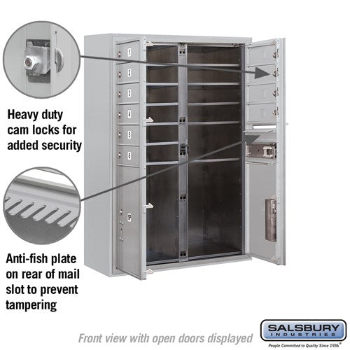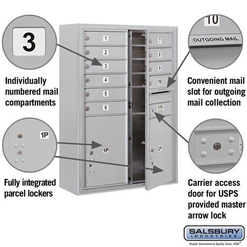 This 11-door surface-mounted mailbox is designed for USPS access and includes 10 tenant compartments and 2 parcel lockers. Constructed from heavy-duty aluminum with a durable powder-coated finish, it is suitable for both indoor and outdoor use.