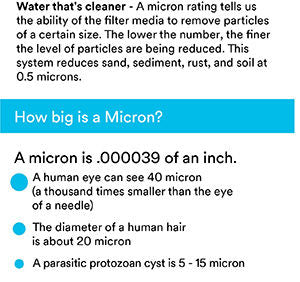 A: Chlorine taste and odor, microbial cysts, and particulates like sand, sediment, rust, and soil (down to 0.5 microns).