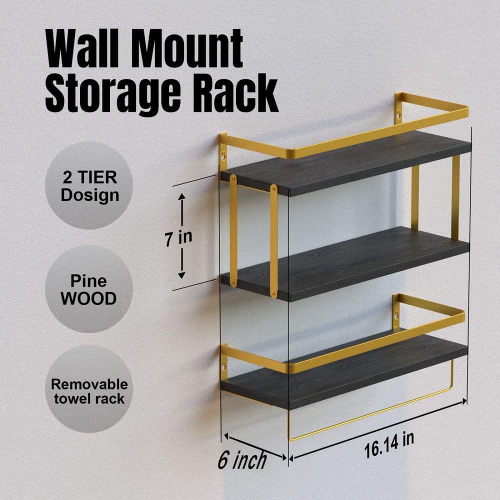 16.14 in. W x 6 in. D x 3 in. H Gold Black 2+1 Tier Bathroom Wall Mounted Floating Shelves with Metal Frame