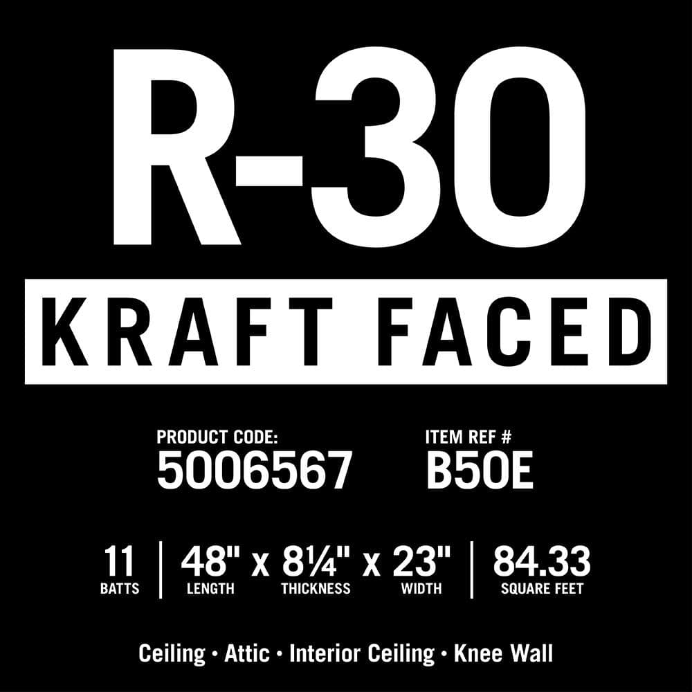High-density R-30 EcoBatt fiberglass batts deliver superior thermal and acoustic performance for cathedral ceilings and attics. Pre-cut 48 in x 23 in batts with durable kraft vapor retarder install quickly with low dust and snug recovery.