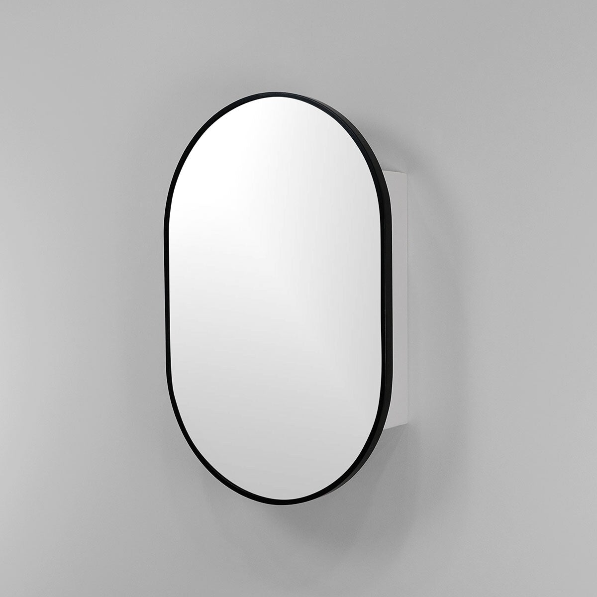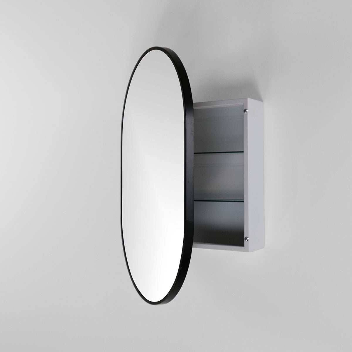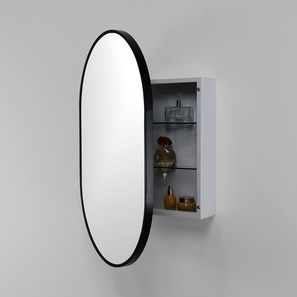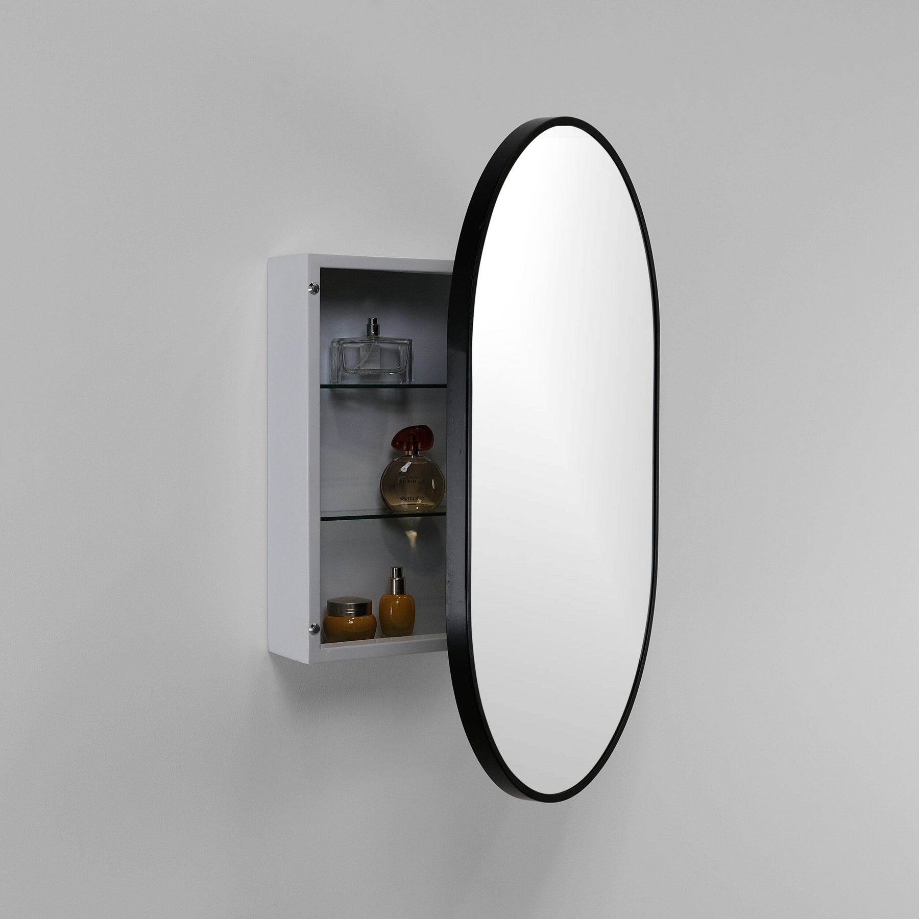 Transform your bathroom into a sanctuary of modern sophistication with this oval mirrored medicine cabinet. Its minimalist black matte finish and sleek oval mirror create a striking focal point while amplifying light and space, perfect for those with a discerning taste. Pair it with monochrome tiles for a chic, timeless look. This cabinet is not only a practical addition but an essential feature of luxurious, contemporary living.
