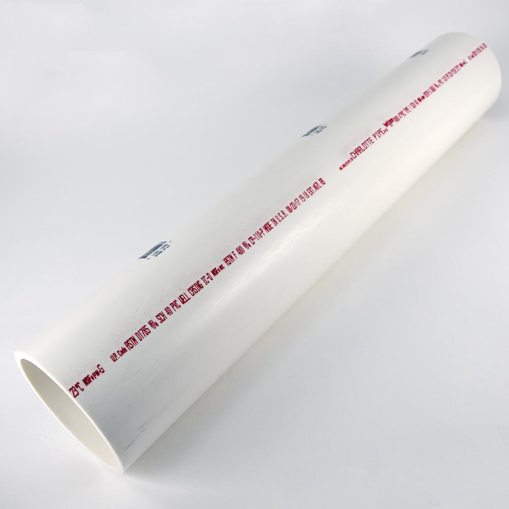 PVC schedule 40 white pipe with red print that is dual marked for DWV and pressure applications