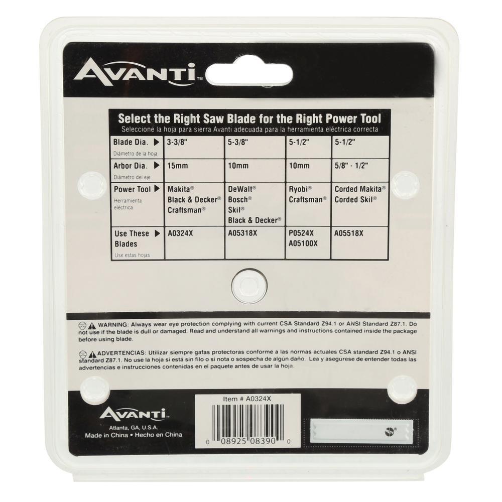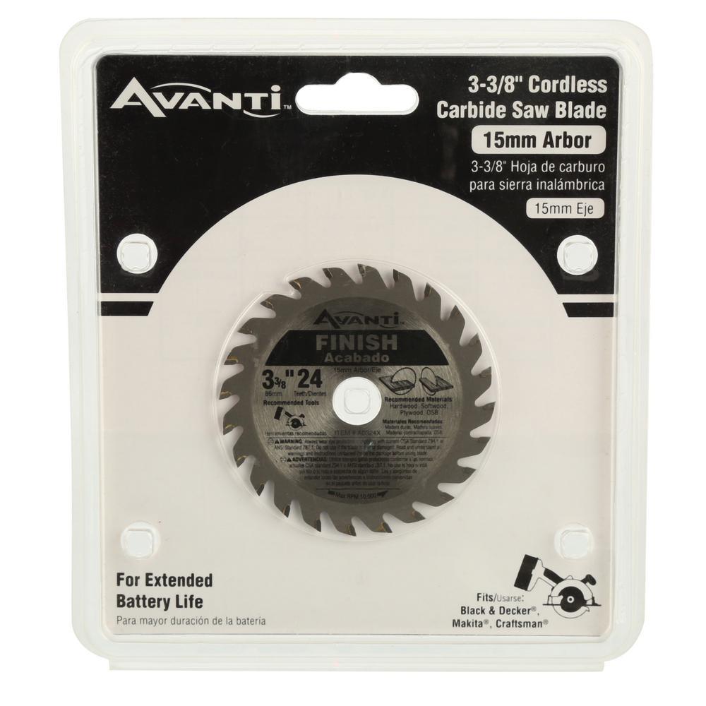 The Avanti 3-3/8 in. x 24 Tooth Finish Circular Saw Blade is ideal for wood and oriented-strand board (OSB). The high-quality steel is manufactured with carbide and lasts up to 30 times longer than regular steel blades. It is durable, economical and can be sharpened when needed.