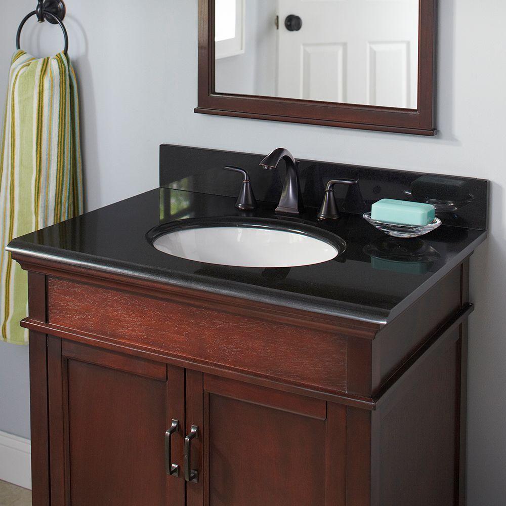 The Pegasus 31 in. W Granite Vanity Top in Midnight Black with White Basin adds an elegant appearance to any bathroom. The durable granite is pre-attached to an under-mounted porcelain sink for your convenience. It can easily be attached to a 30 in. vanity cabinet and faucet holes are pre-drilled for easy installation.