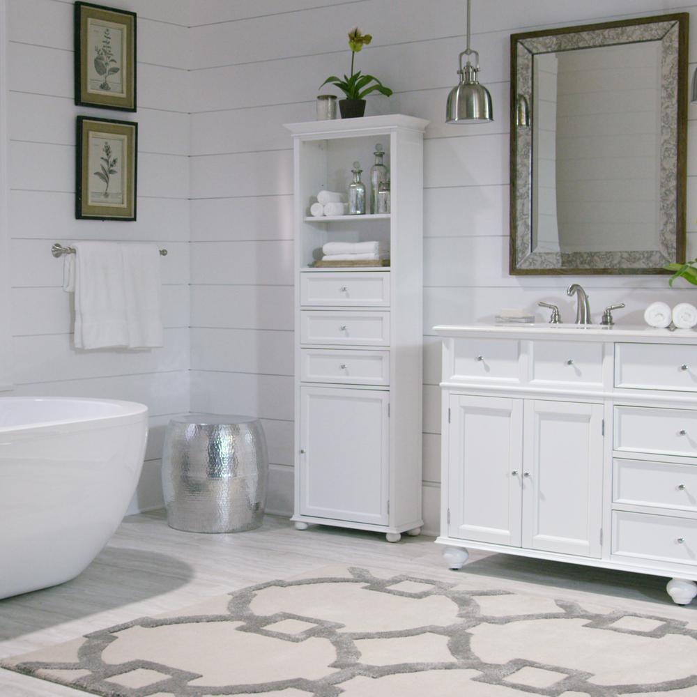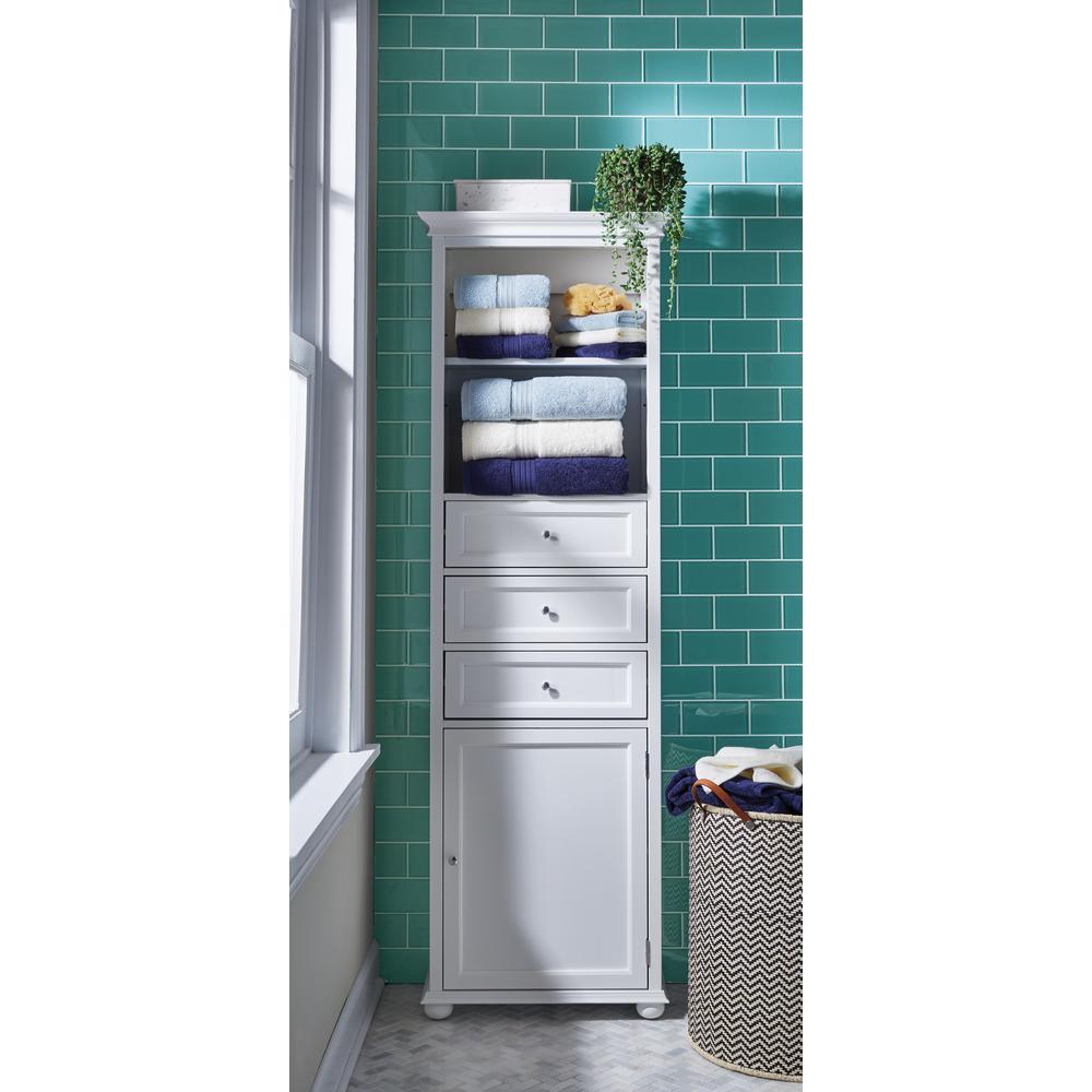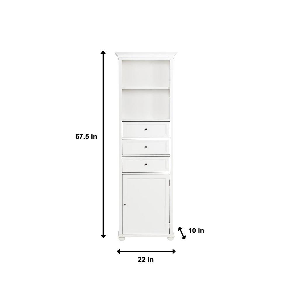 The Hampton Harbor 22 in. W Linen Cabinet in White offers fresh appeal and plenty of storage for your bathroom or walk-in closet. A beautiful bottom door opens to reveal a spacious interior perfect for towels and sheets, while three drawers provide extra space for other linens. Crafted with extra-dense, no-warp wood composite and wood veneer on a solid wood frame, the durable cabinet features several distinctive details including crown molding, bun feet and a recessed panel design, creating a piece that is both decorative and fully functional.