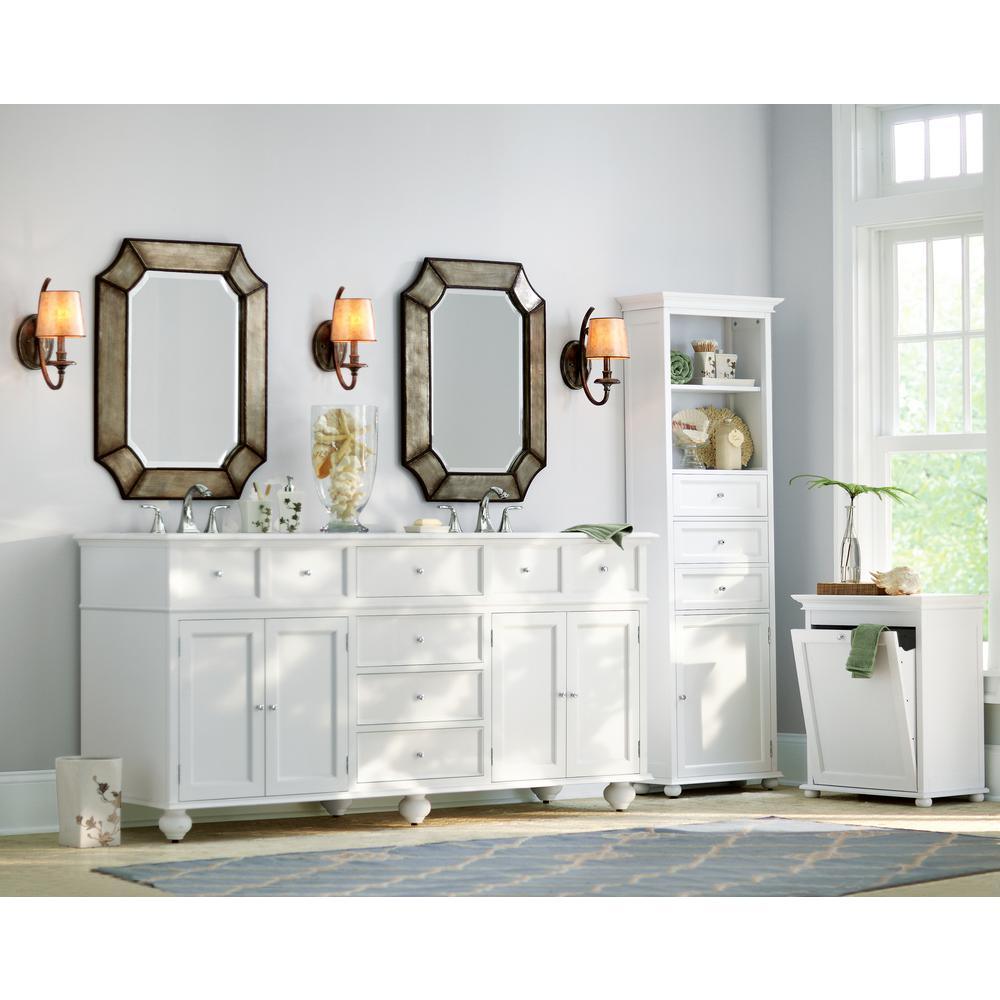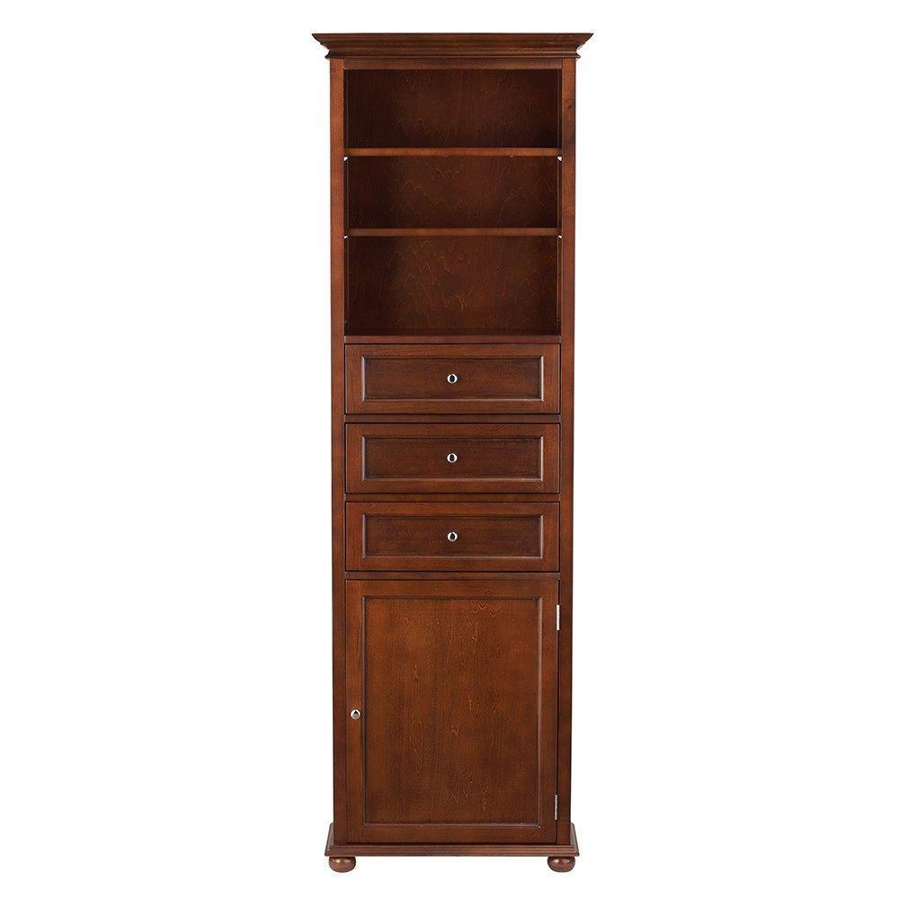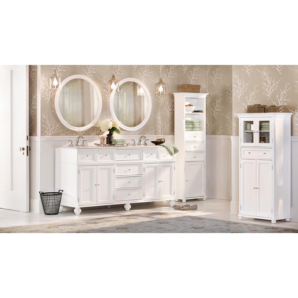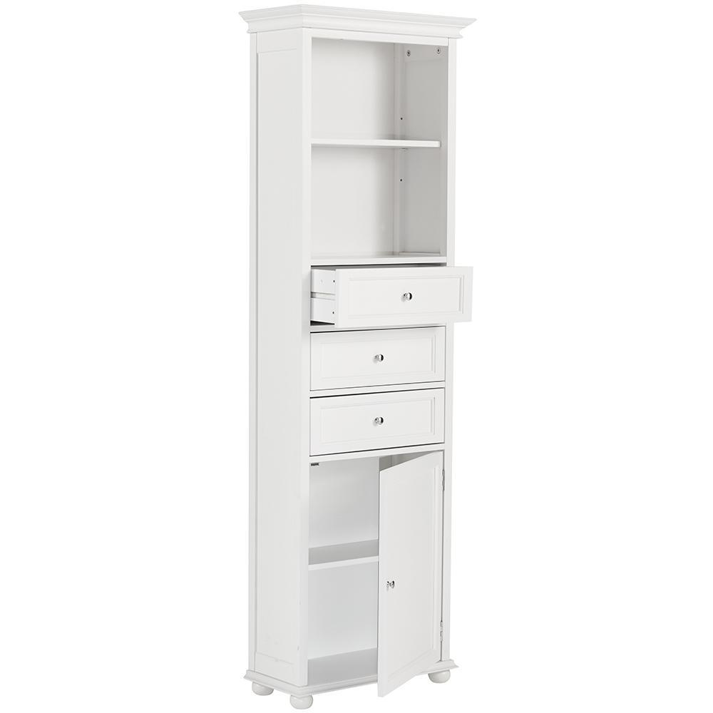 The Hampton Harbor 22 in. W Linen Cabinet in White offers fresh appeal and plenty of storage for your bathroom or walk-in closet. A beautiful bottom door opens to reveal a spacious interior perfect for towels and sheets, while three drawers provide extra space for other linens. Crafted with extra-dense, no-warp wood composite and wood veneer on a solid wood frame, the durable cabinet features several distinctive details including crown molding, bun feet and a recessed panel design, creating a piece that is both decorative and fully functional.