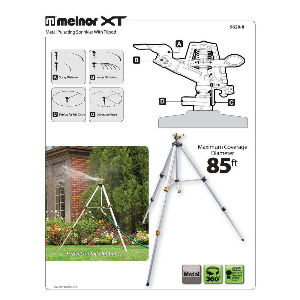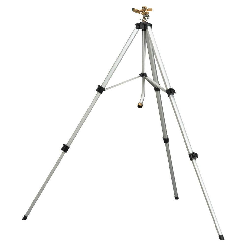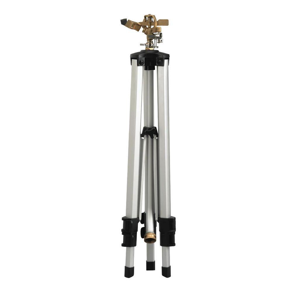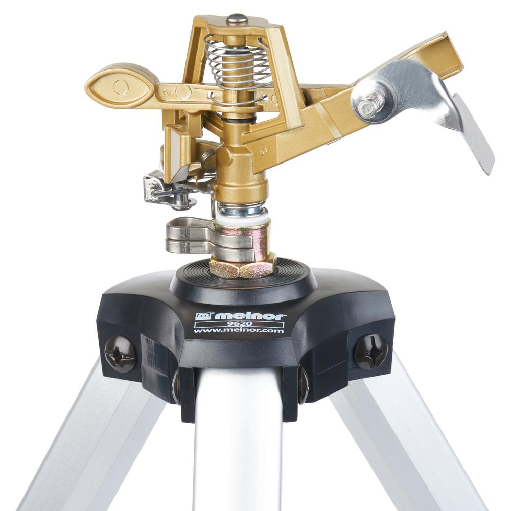 The Melnor 5,600 sq. ft. Brass Impact Tripod Sprinkler is perfect for watering large areas. The pulsating sprinkler is attached to a durable metal tripod that extends 26-48 in. H and will water an area of up to 85 ft. in Dia.