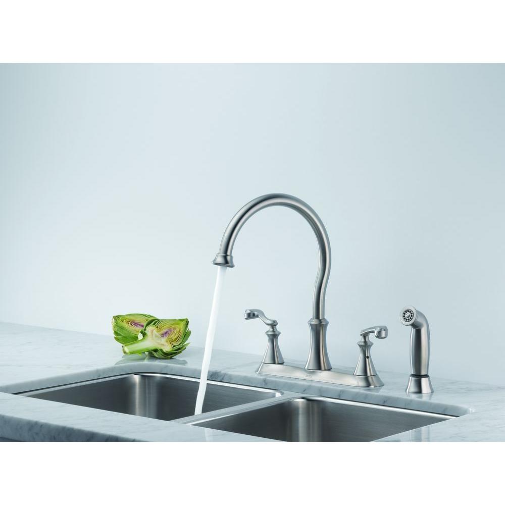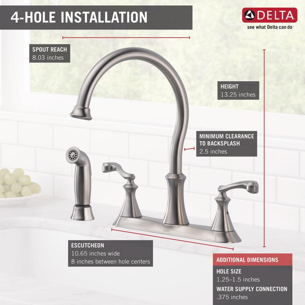 The Delta Vessona 2-Handle Kitchen Faucet in Stainless has soft, flowing curves to the spout and handles for an elegant look. It features a high-arc spout to make filling large pots quick and easy. It also has a side-mount sprayer with an 8 in. reach to make washing dishes and cleaning up the sink area more convenient.