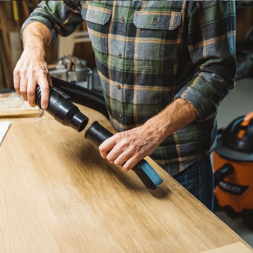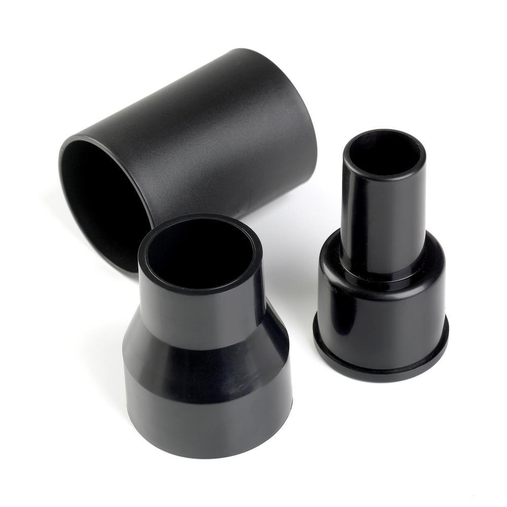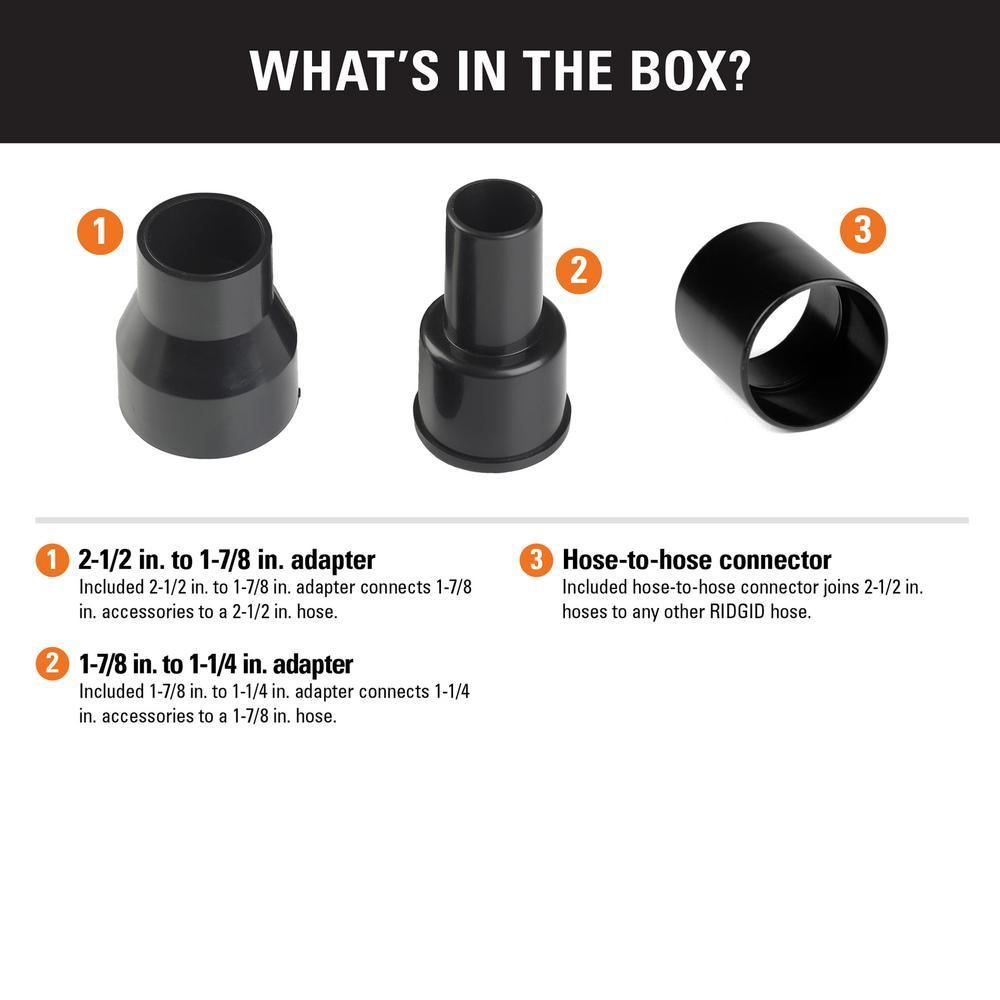 This RIDGID wet dry vac adapter kit adapts to vacuum hoses, wands, and accessories of varying sizes and helps maximize your accessory use. You can use the hose-to-hose adapter to connect two 2-1/2 in. hoses together for extended reach or use 1 of the other adapters to connect your accessory to a smaller hose. The 2-1/2 in. to 1-7/8 in. adapter connects the 1-7/8 in. accessories to a 2-1/2 in. hose and the 1-7/8 in. to 1-1/4 in. adapter connects 1-1/4 in. accessories to a 1-7/8 in. hose.