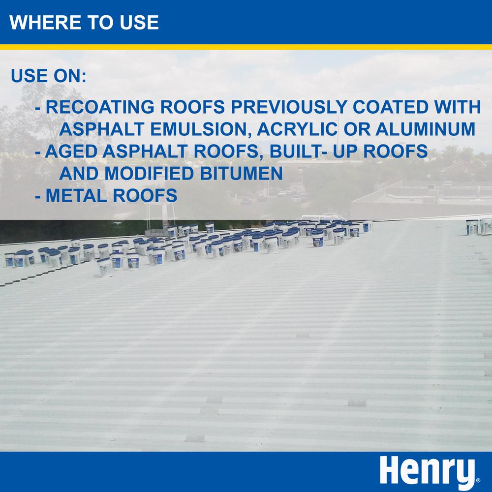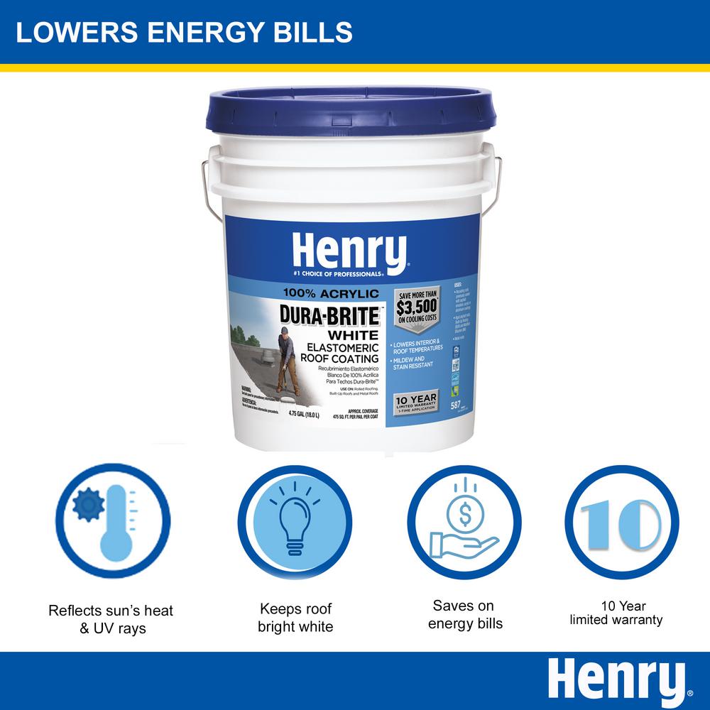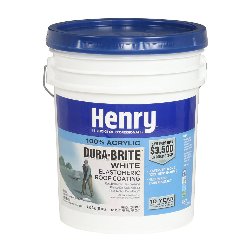 You get many benefits for using this Henry 587 100% Acrylic Dura-Brite White Elastomeric Roof Coating. When compared to economy grade reflective roof coatings, its elongation, peel strength and solar reflectance values offer weather protection, high solar reflectivity and superior longevity. This is a premium, high solids, reflective roof coating. When cured, it allows moisture vapor to vent or breathe out of underlying substrate.