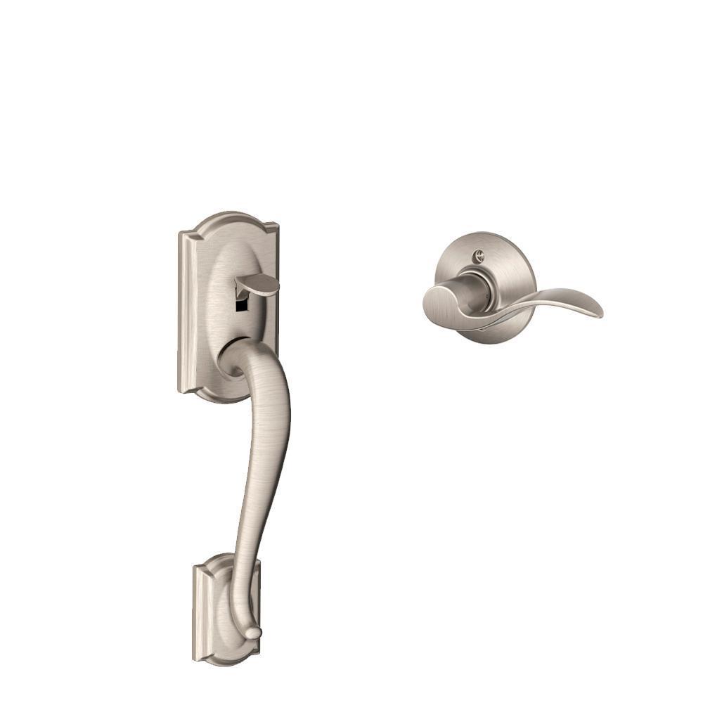 The Schlage Camelot Bright Brass Entry Door Handle and Left Handed Accent Lever is perfect for use on exterior doors where extra security is needed. The left handed Accent lever features an elegant wave-like design that effortlessly matches any room's style, and the handle's Camelot trim features scalloped architectural details make any room charming and approachable. When finished in Bright Brass, the deadbolt looks especially classic. The lever unlocks when the door is opened from the inside, allowing you to leave quickly and conveniently and re-enter easily. Plus, it was designed and tested with strength and durability in mind.
