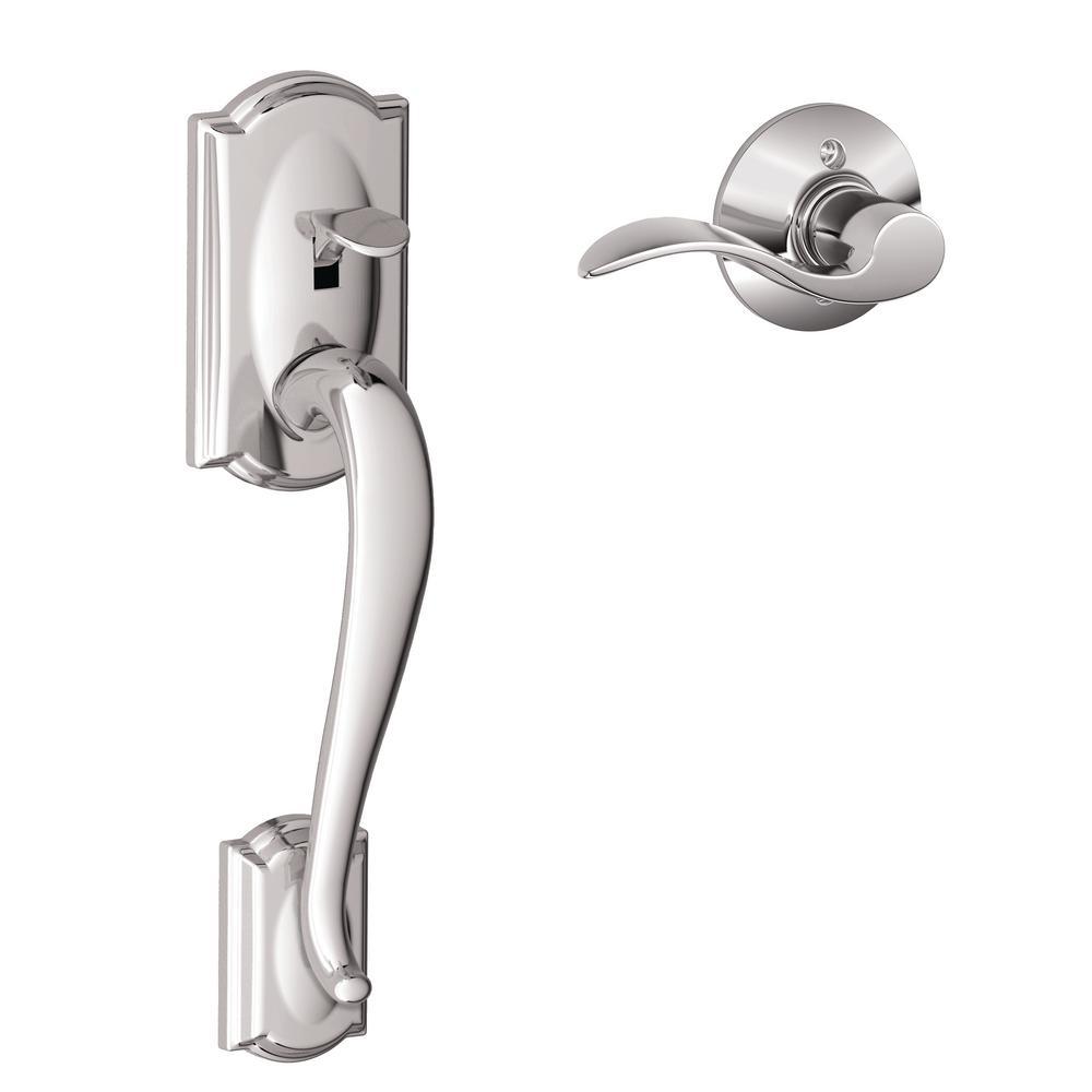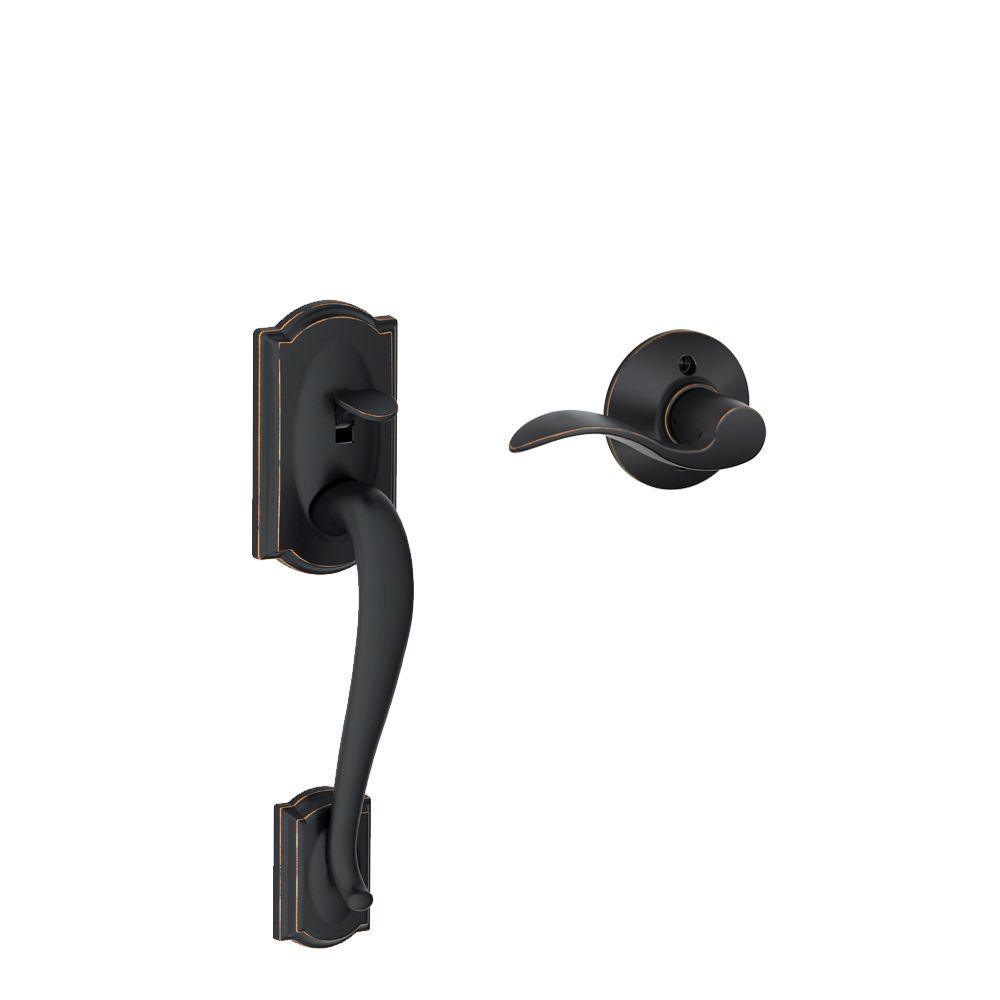 The Schlage Camelot Aged Bronze Entry Door Handle and Right Handed Accent Lever is perfect for use on exterior doors where extra security is needed. The right handed Accent lever features an elegant wave-like design that effortlessly matches any room's style, and the handle's Camelot trim features scalloped architectural details make any room charming and approachable. Its Aged Bronze finish features warm, copper tones that break through its darker, aged exterior. The lever unlocks when the door is opened from the inside, allowing you to leave quickly and conveniently and re-enter easily. Plus, it was designed and tested with strength and durability in mind.