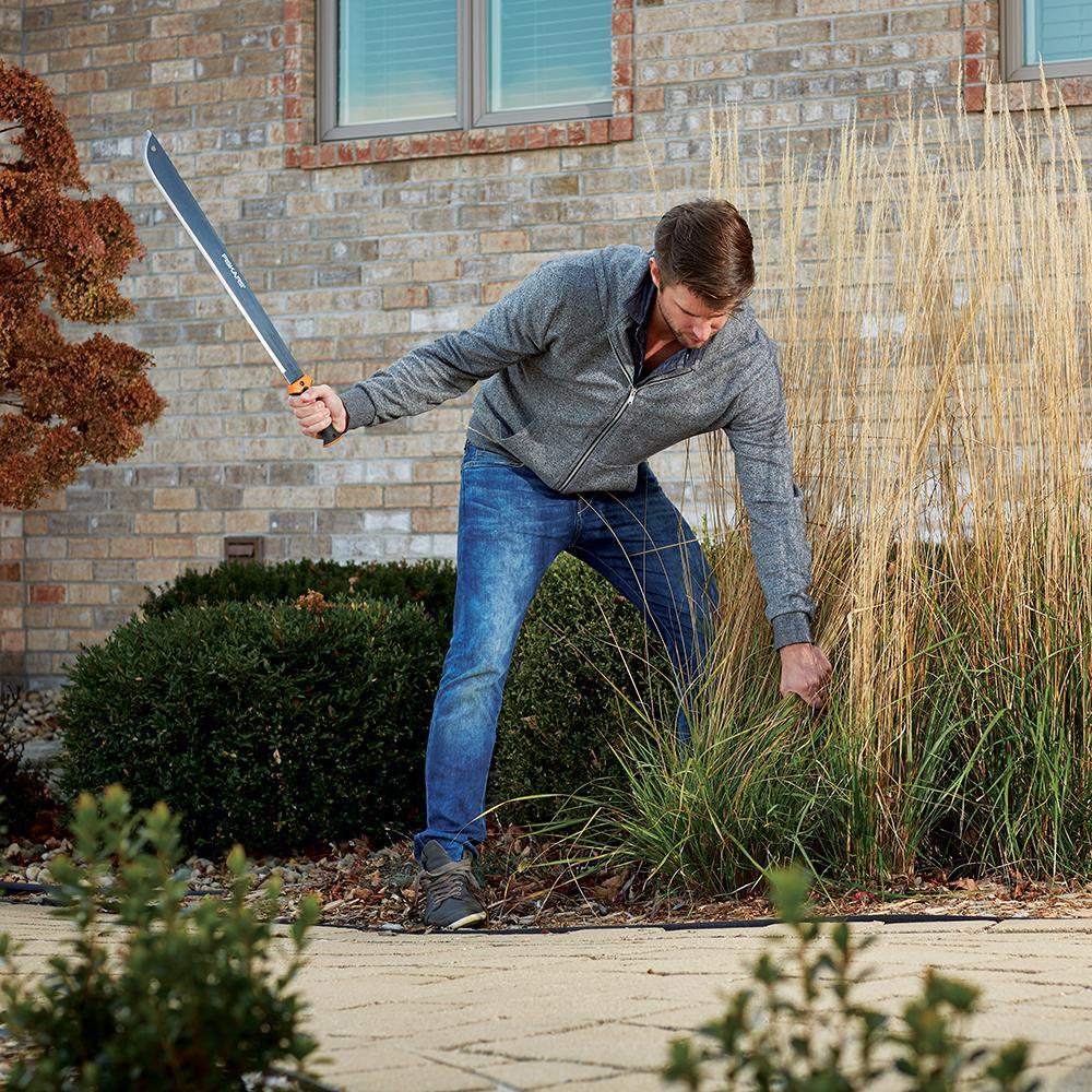 Rip through underbrush and even small trees with a powerful Machete that outperforms flimsy, stamped-steel blades. An 22 in. long, tempered steel blade features an ultra-sharp edge that will clear everything from light brush to heavy, woody growth. A lightweight design increases swing speed to help you clear brush more quickly, and a Softgrip handle provides excellent grip and comfortable use.