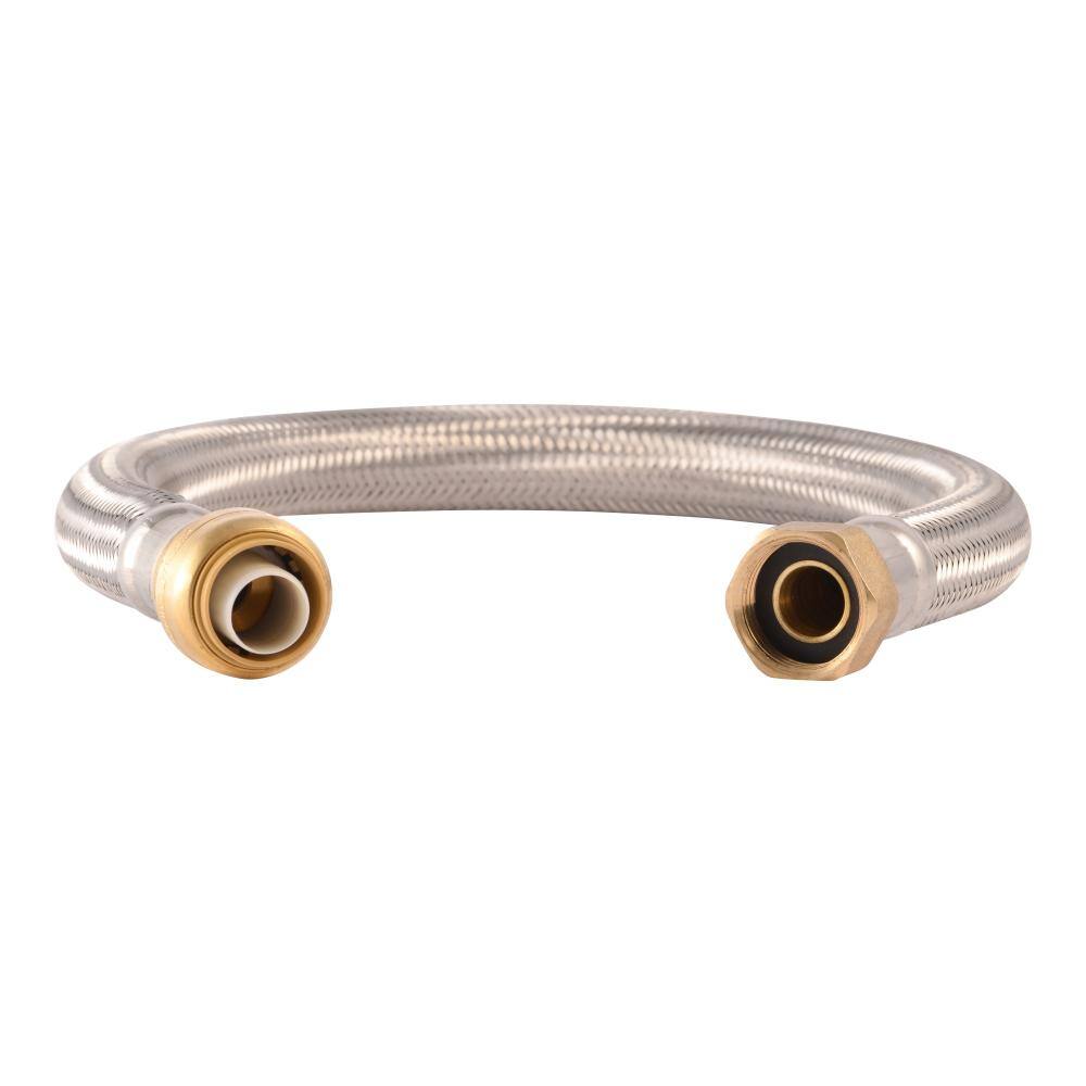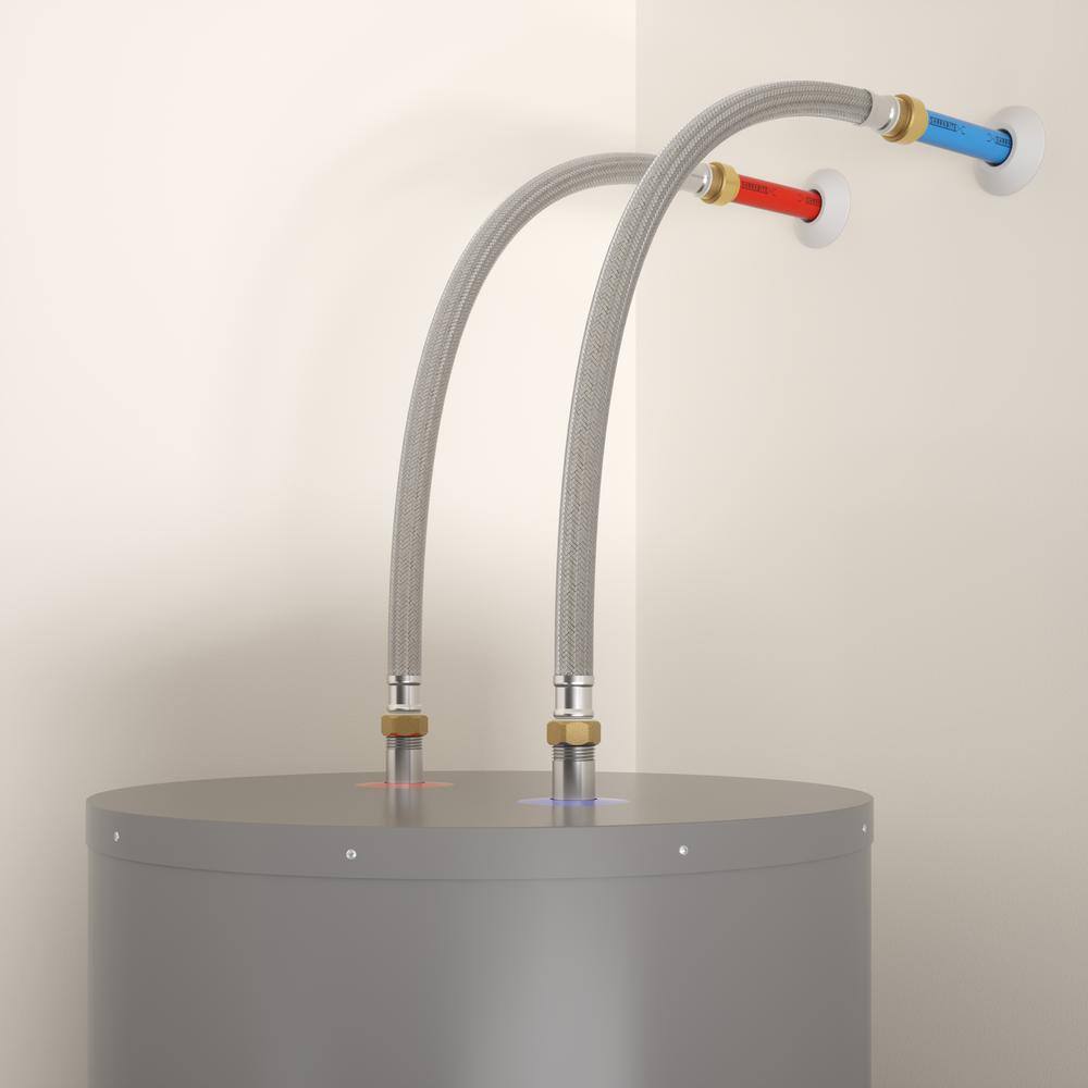 Flexible, lead-free braided stainless steel connector for fast water heater hookups. Features a 3/4 in. push-to-connect end for copper, PEX, CPVC, and PE-RT, and a 3/4 in. FIP end for the heater. Corrosion-resistant DZR brass fittings simplify installation without solder or glue.